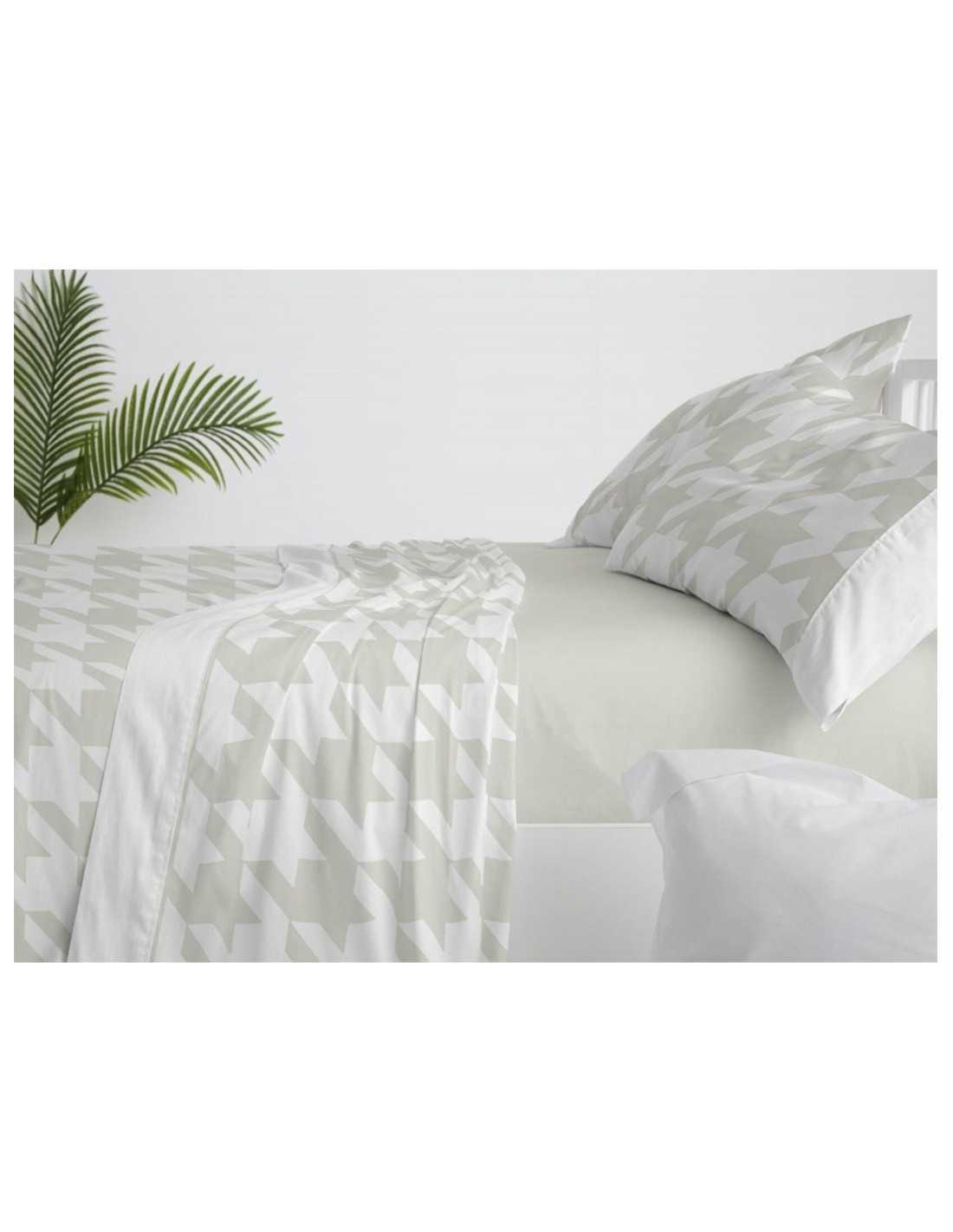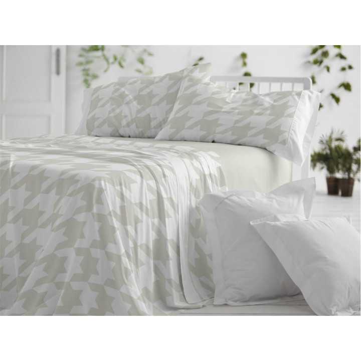 Juego de sábanas de la marca Burrito Blanco 100% algodón en color caqui con un diseño de pata de gallo muy grande, que dará a tu dormitorio un aire elegante.