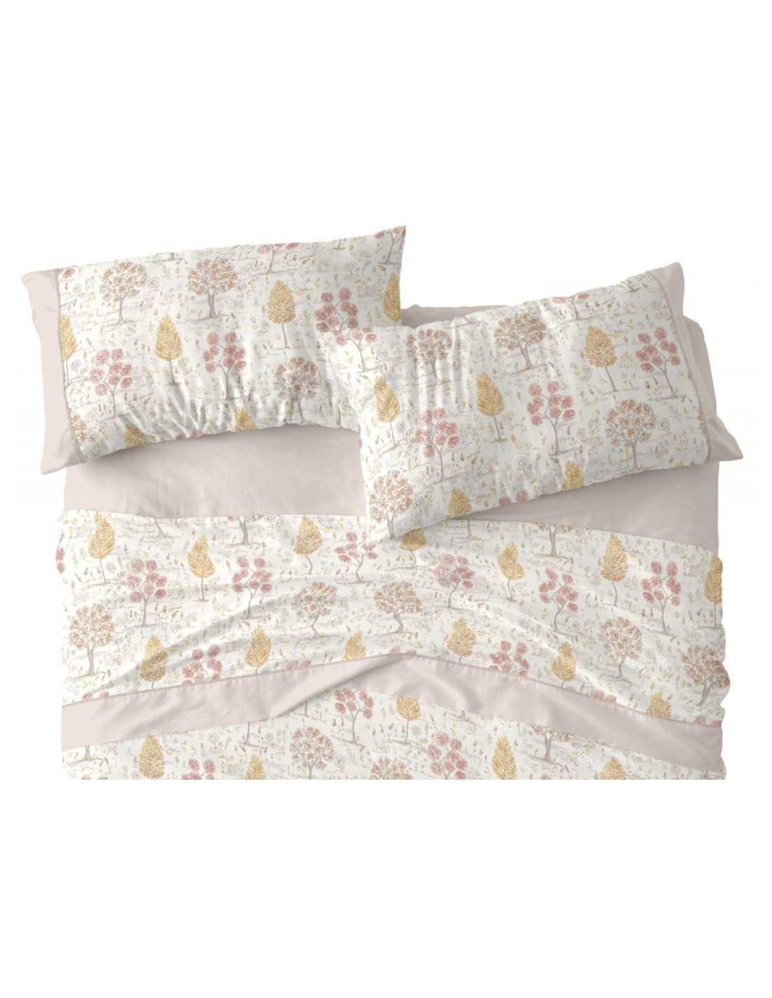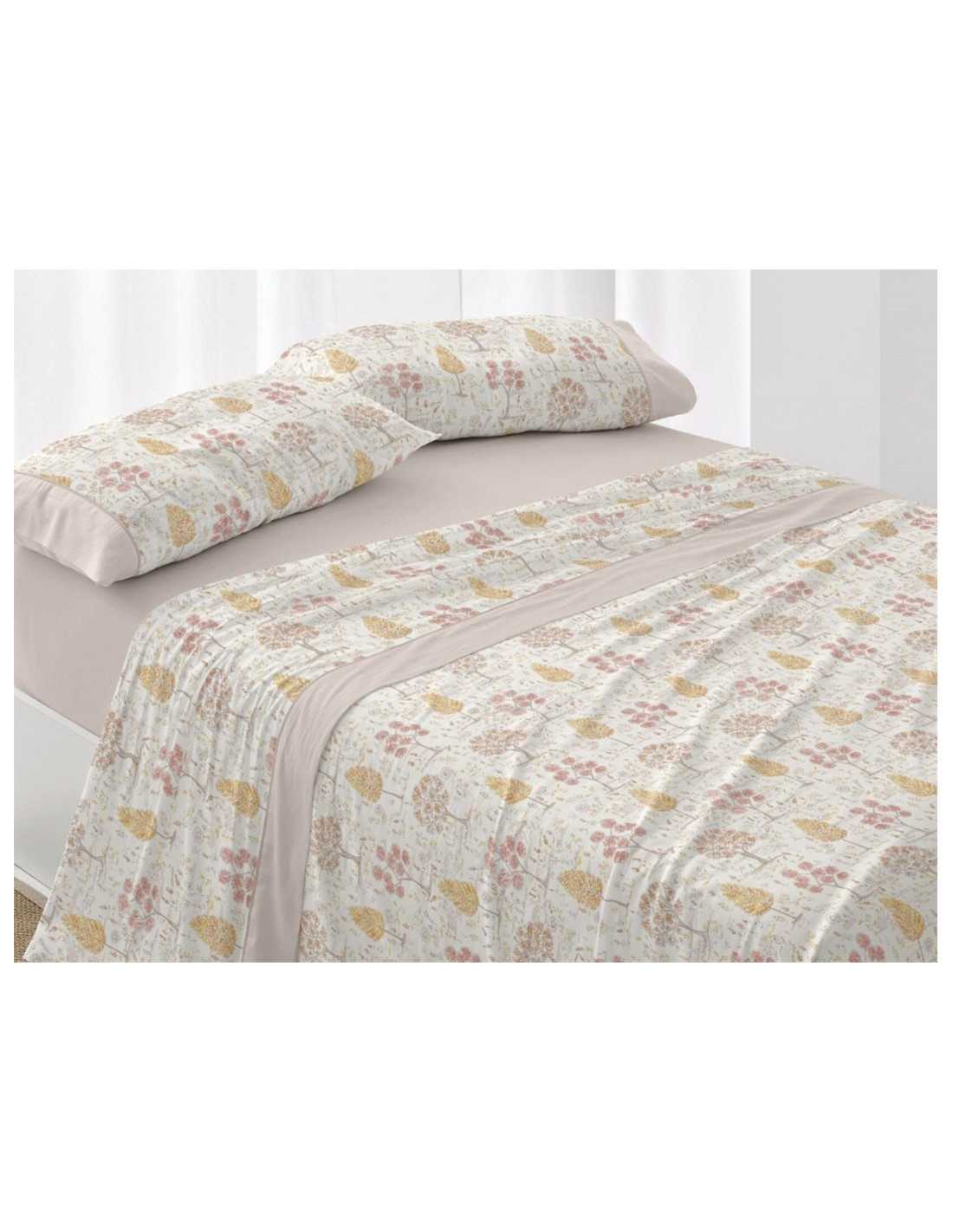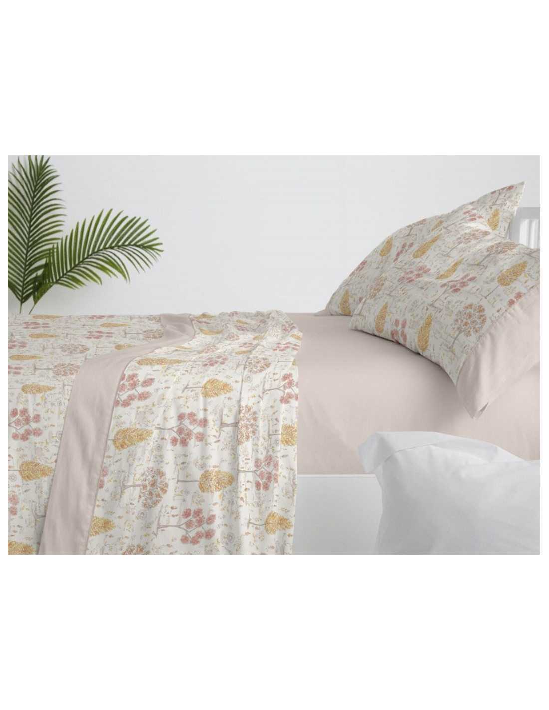 El juego de sábanas Amelie de Burrito Blanco tiene un diseño fresco y muy decorativo con motivos botánicos de árboles en tonos teja, camel, beige, canela, piedra y salvia sobre beige claro. La bajera es lisa a juego y la encimera y el almohadón lucen un ribete liso, Su composición es de 50% algodón y 50% poliéster