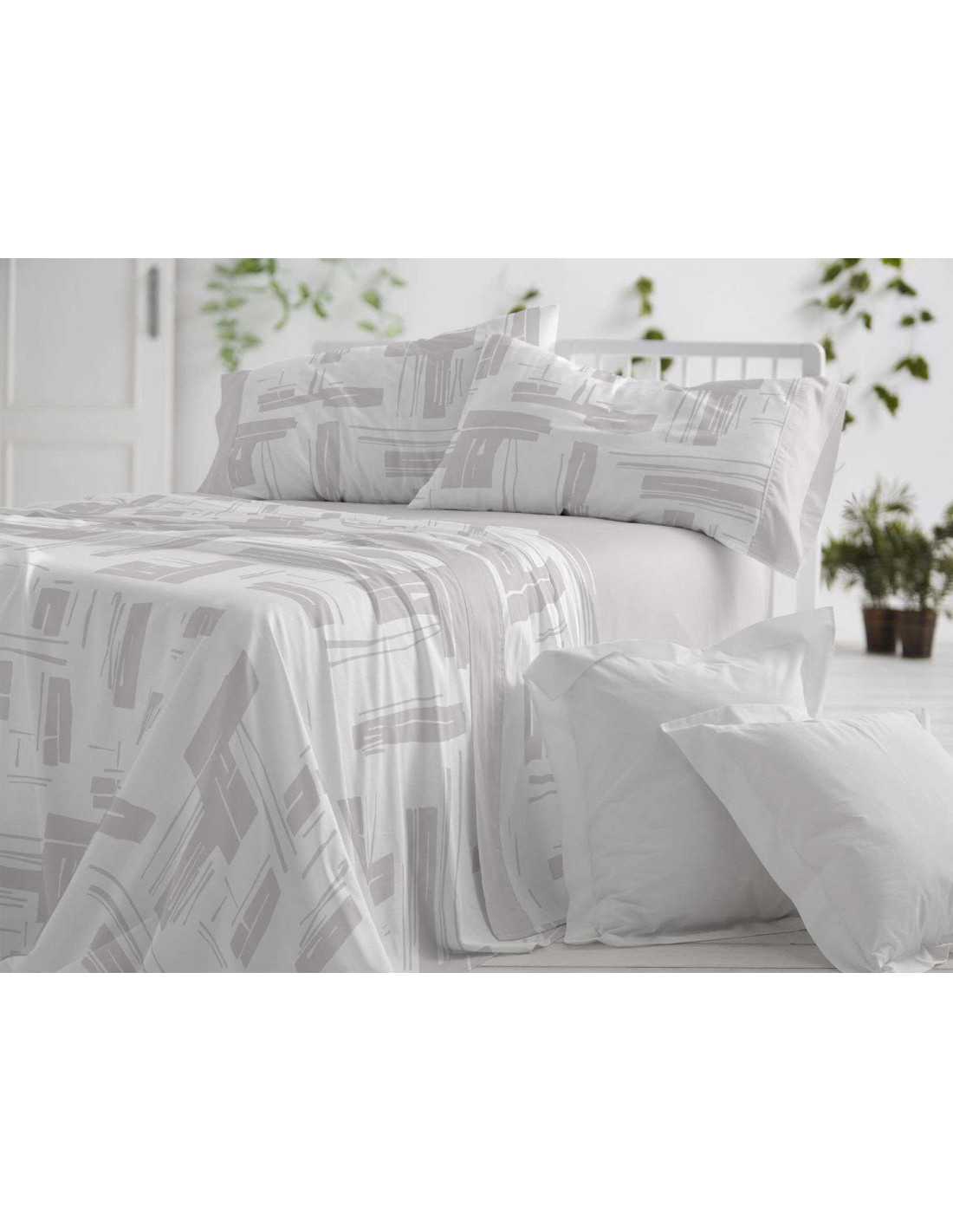 Juego de sábanas de la marca Burrito Blanco en color gris con un diseño geométrico con trazos abstractos, ideal para dar un aire moderno a tu dormitorio.