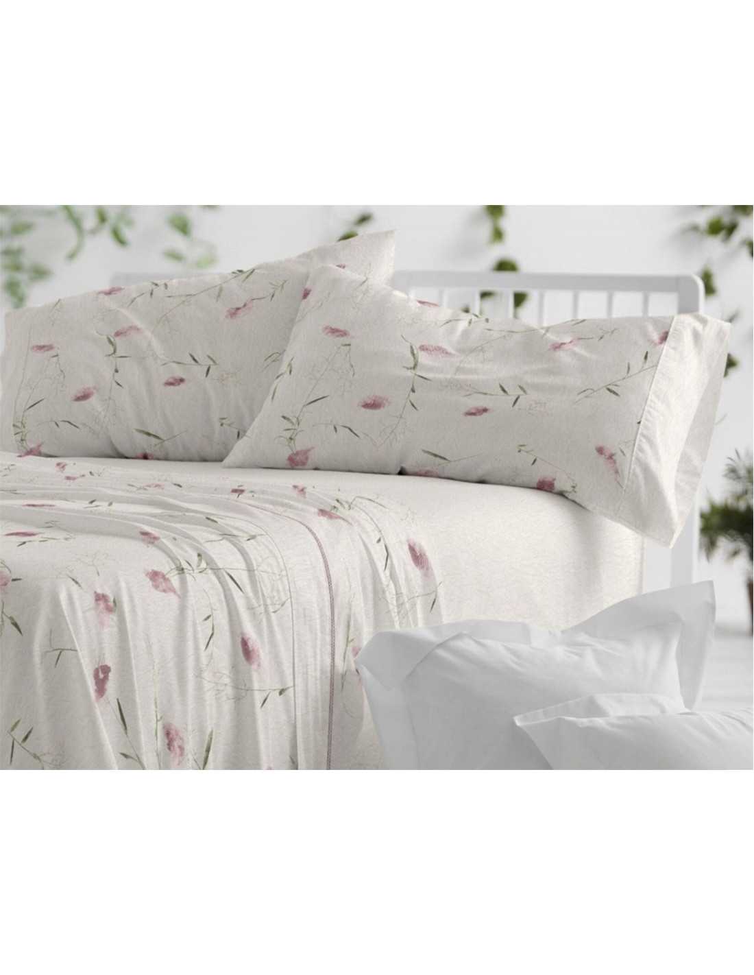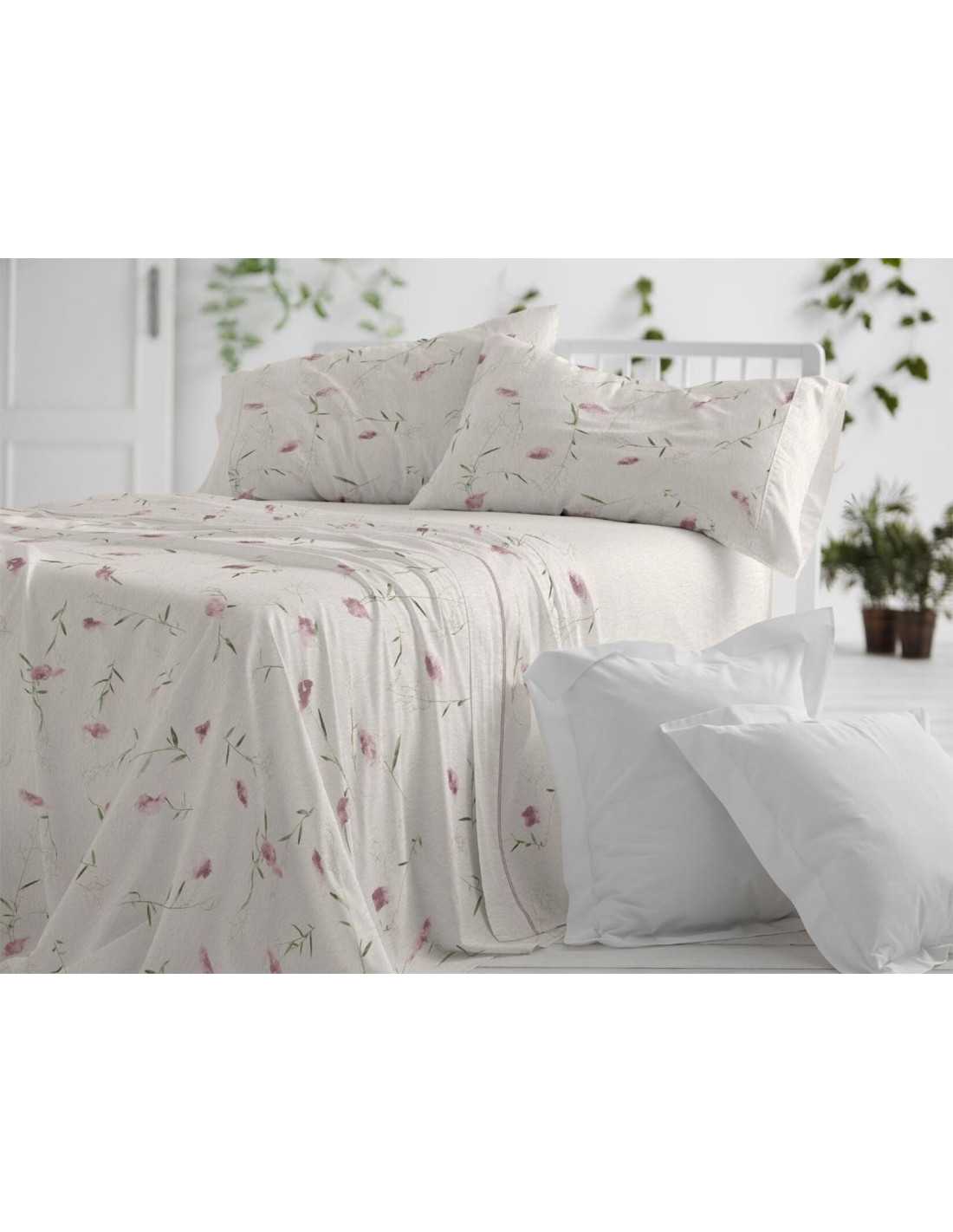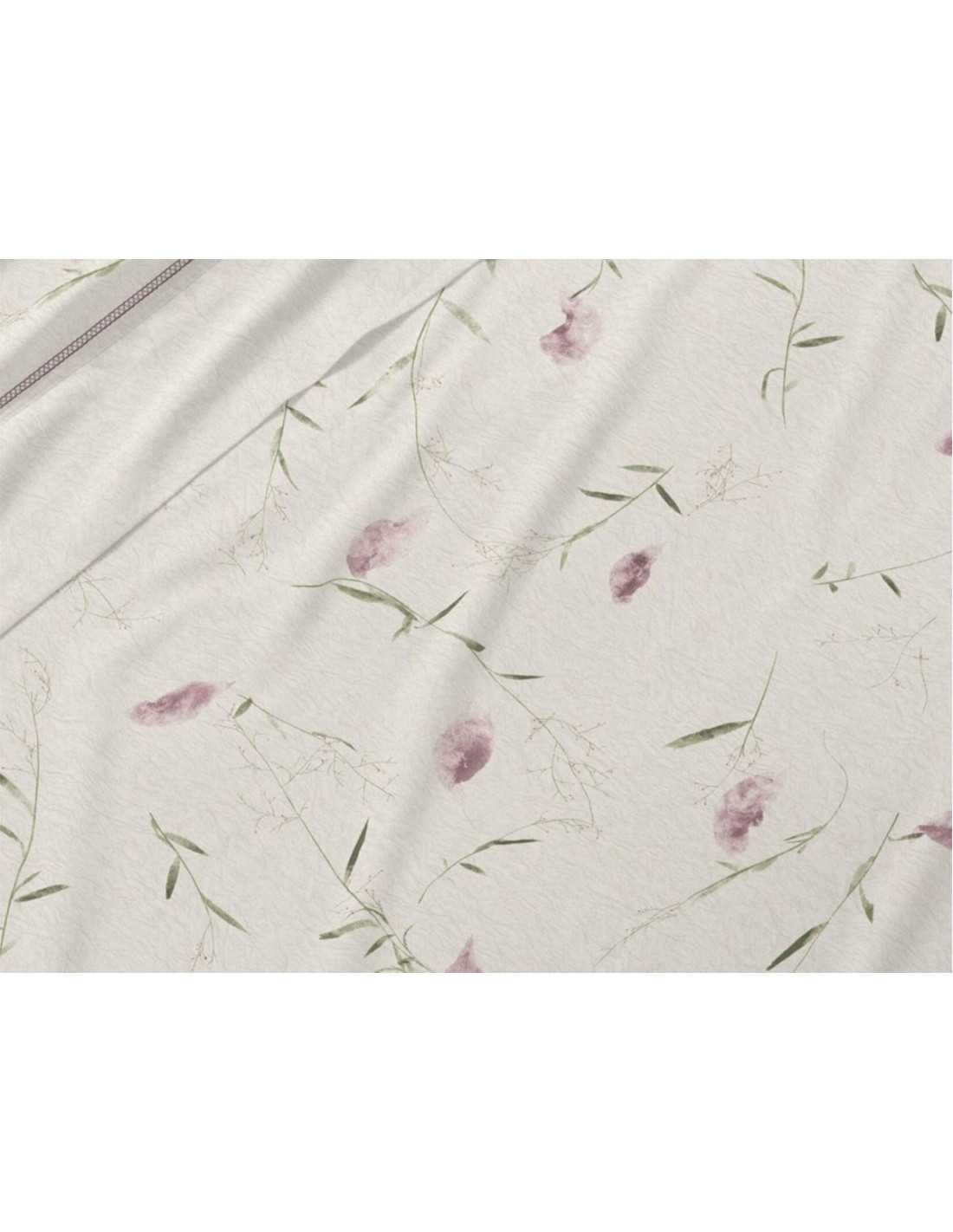 Juego de sábanas de Burrito Blanco modelo Linfa en color rosa con precioso diseño botánico. Un juego de sábanas con encimera, bajera y almohadón.