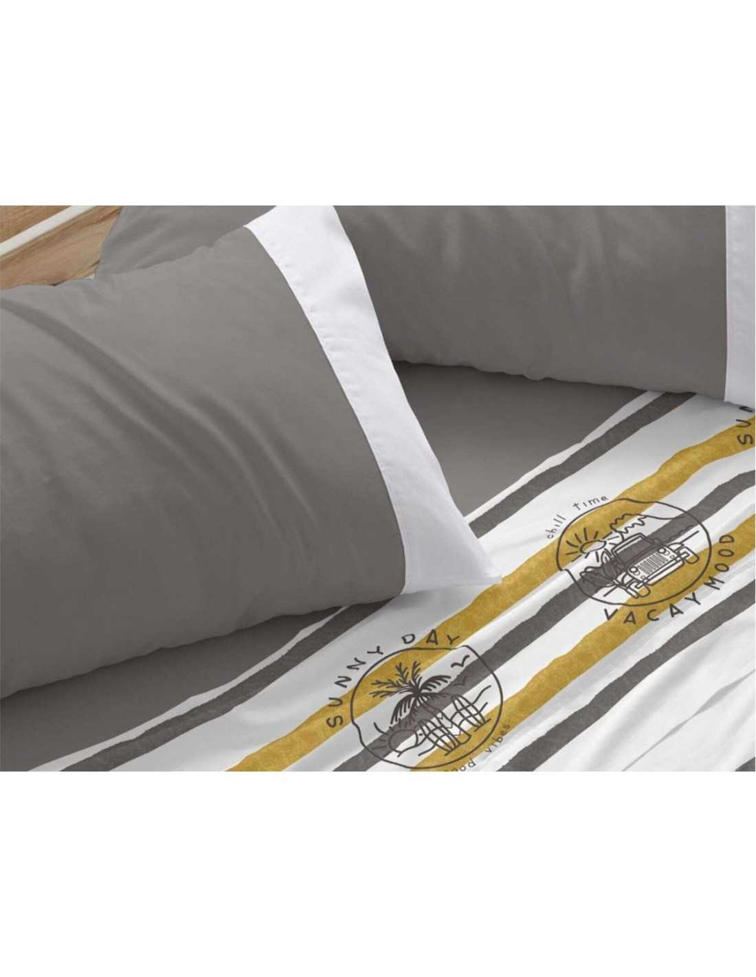 El juego de sábanas Vibes de Burrito Blanco tiene un diseño juvenil con motivos suferos con esterica vintage en colores gris, mostaza y blanco. La bajera es gris lisa y el almohadón luce un ribete blanco. Su composición es de 50% algodón y 50% poliéster