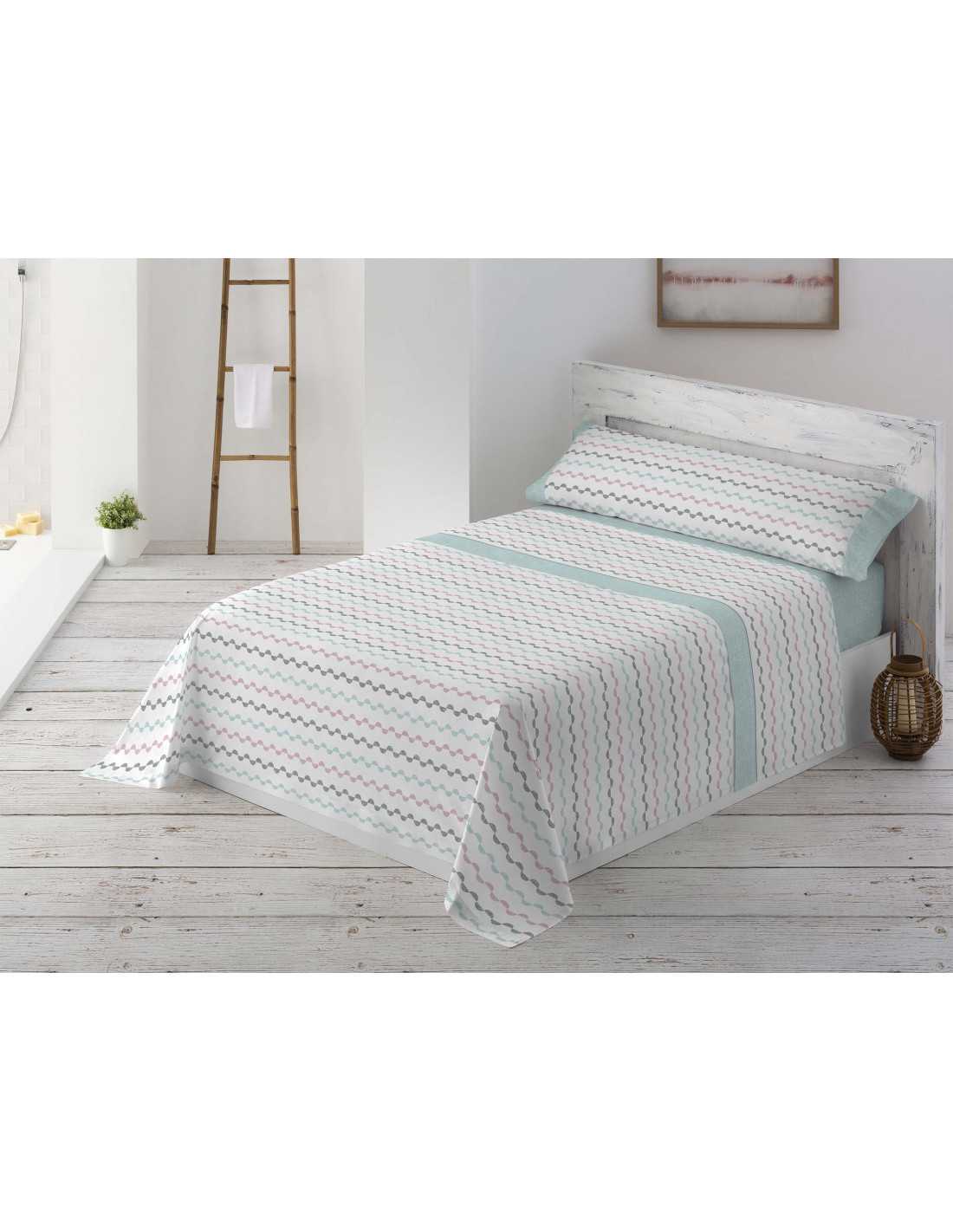 Elvira es un juego de sábanas con un encantador diseño con franjas formadas con semicírculos, con bajera, y detalles de encimera y almohadón en color verde jaspeado. Juego de sábanas con mucho estilo para decorar tu cama y a un precio fantástico.