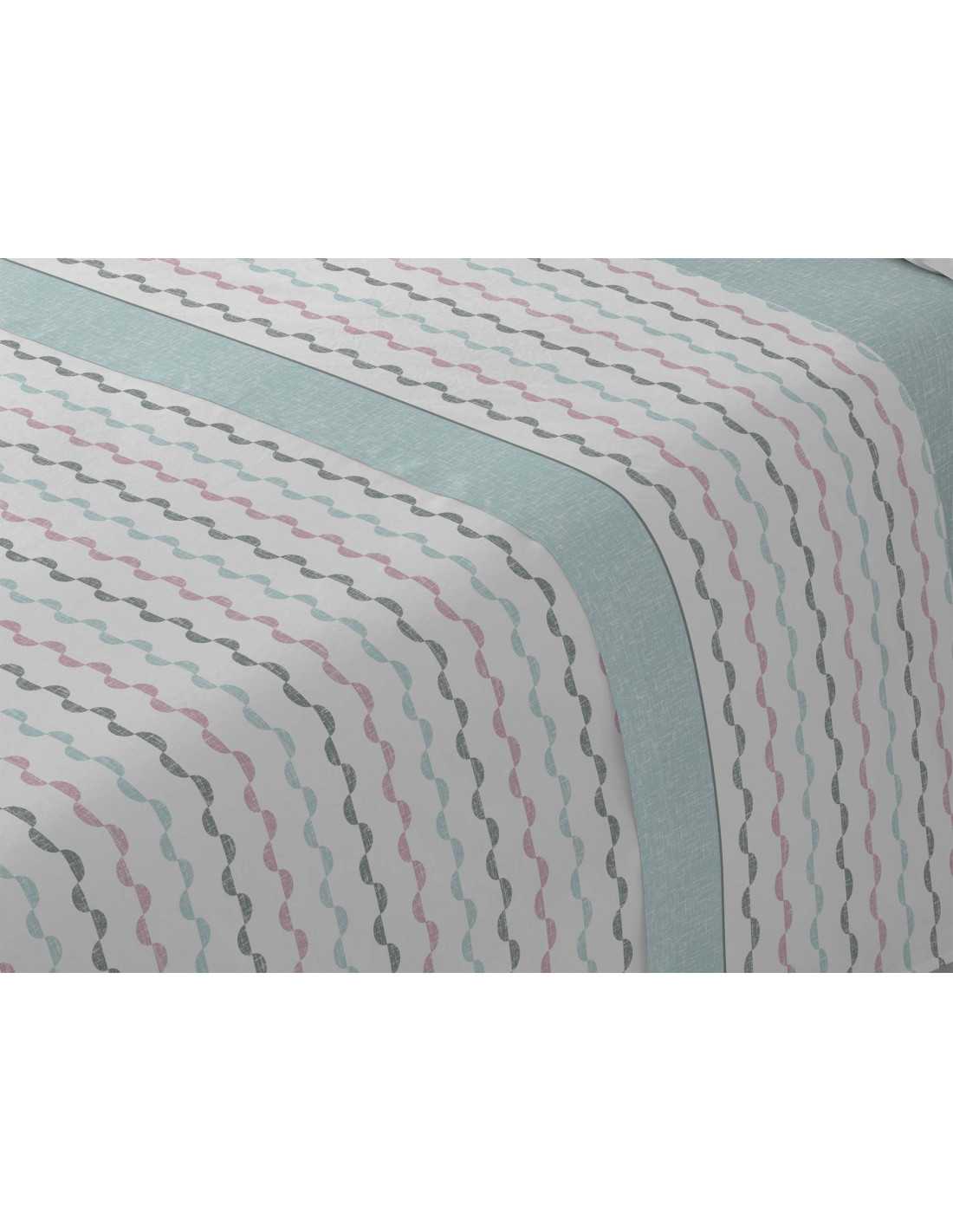 Juego de sábanas de algodón y poliéster en varios tonos con un encantador diseño con franjas formadas con semicírculos, con bajera, y detalles de encimera y almohadón en color verde jaspeado.