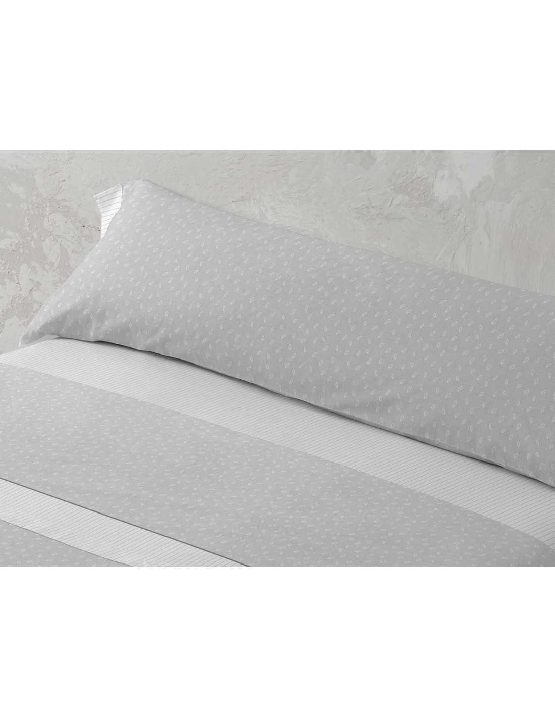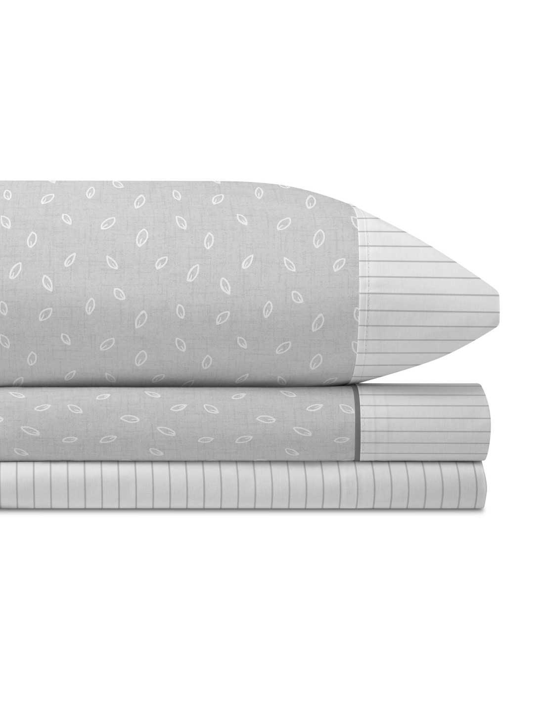 Juego de sábanas de algodón y poliéster en gris con un precioso diseño con pequeñas hojas, con bajera, y detalles de encimera y almohadón en tejido a rayas.