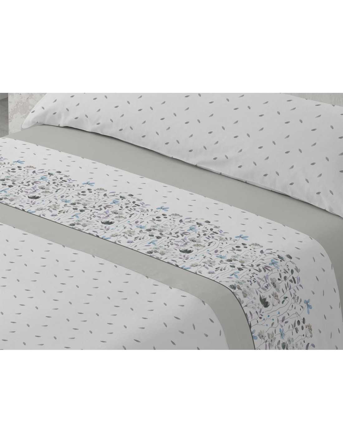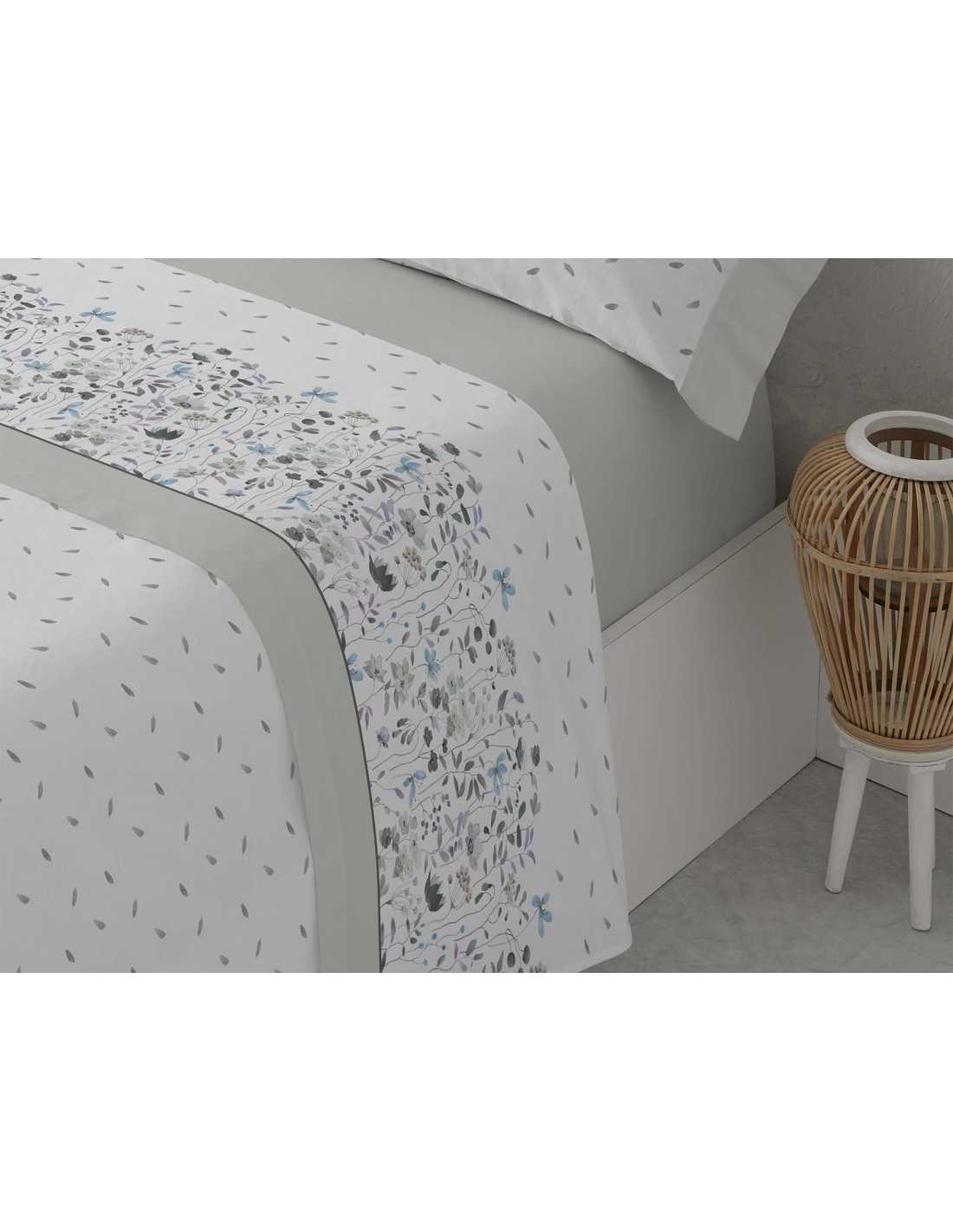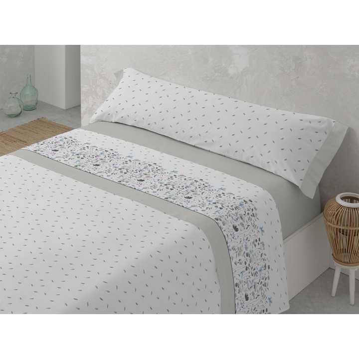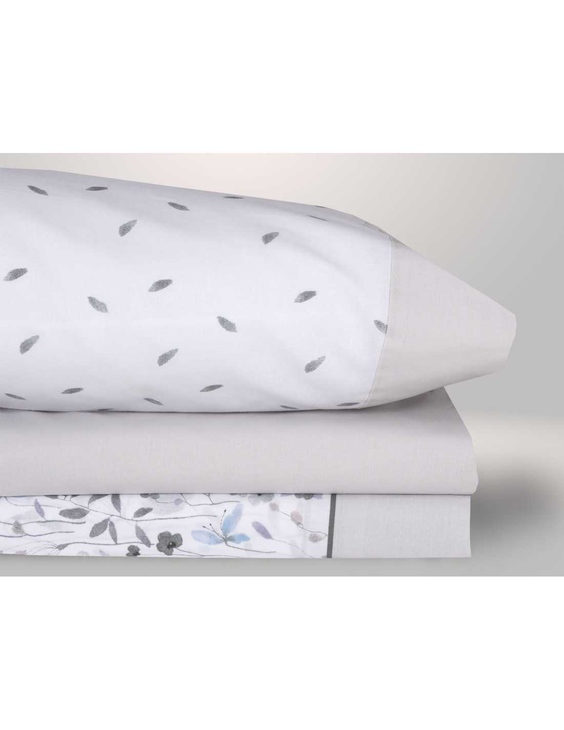 Juego de sábanas de algodón y poliéster en tonos grises con detalles en azul y malva, con un diseño precioso de pétalos y en el embozo impresión floral combinado con la bajera en color liso a juego y detalle en los extremos del almohadón en color liso.