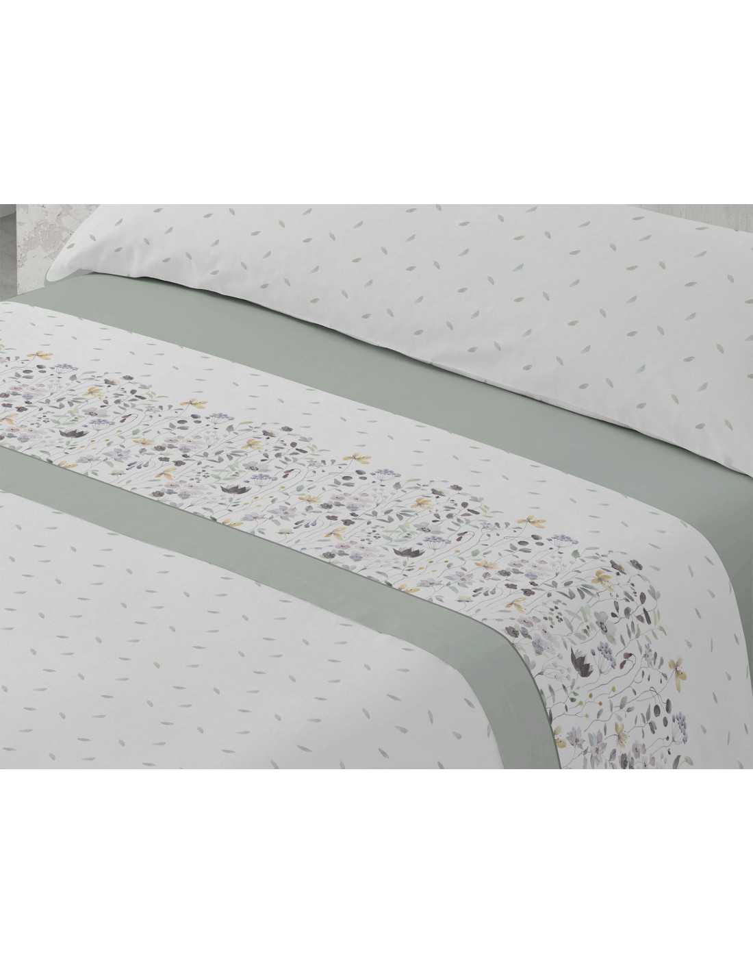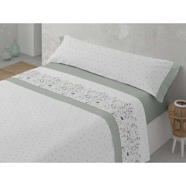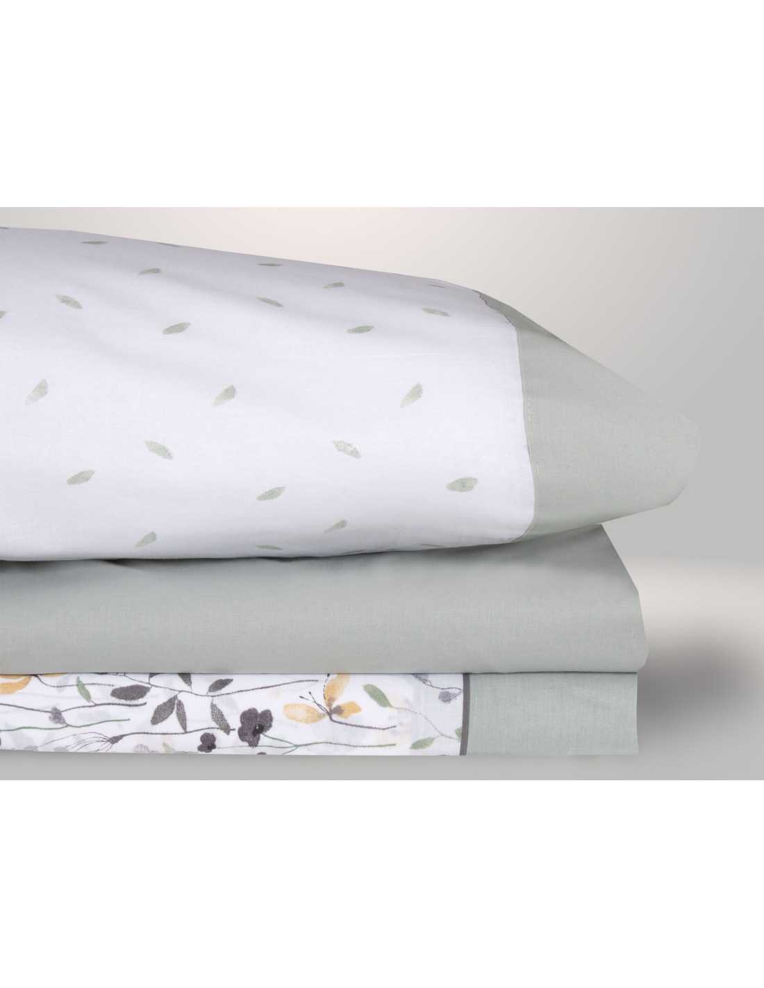 Juego de sábanas de algodón y poliéster en tonos verdes con detalles en amarillo y malva, con un diseño precioso de pétalos y en el embozo impresión floral combinado con la bajera en color liso a juego y detalle en los extremos del almohadón en color liso.