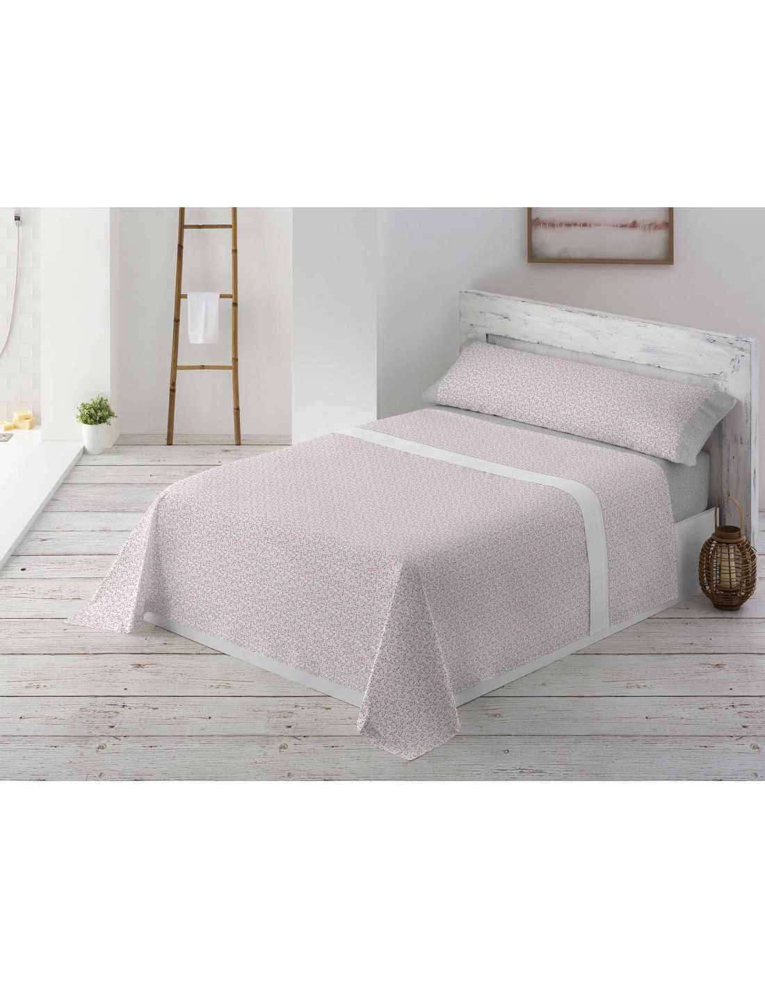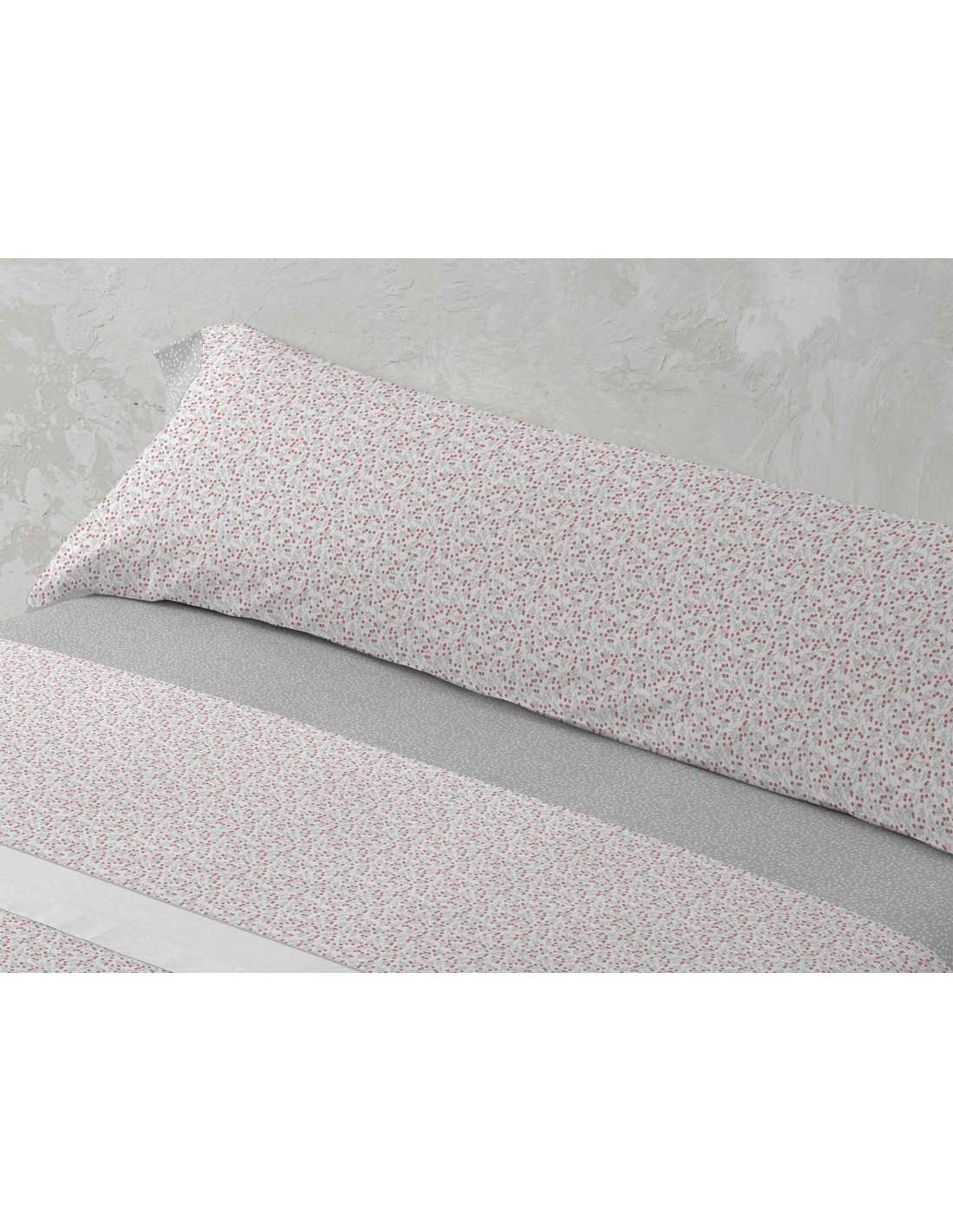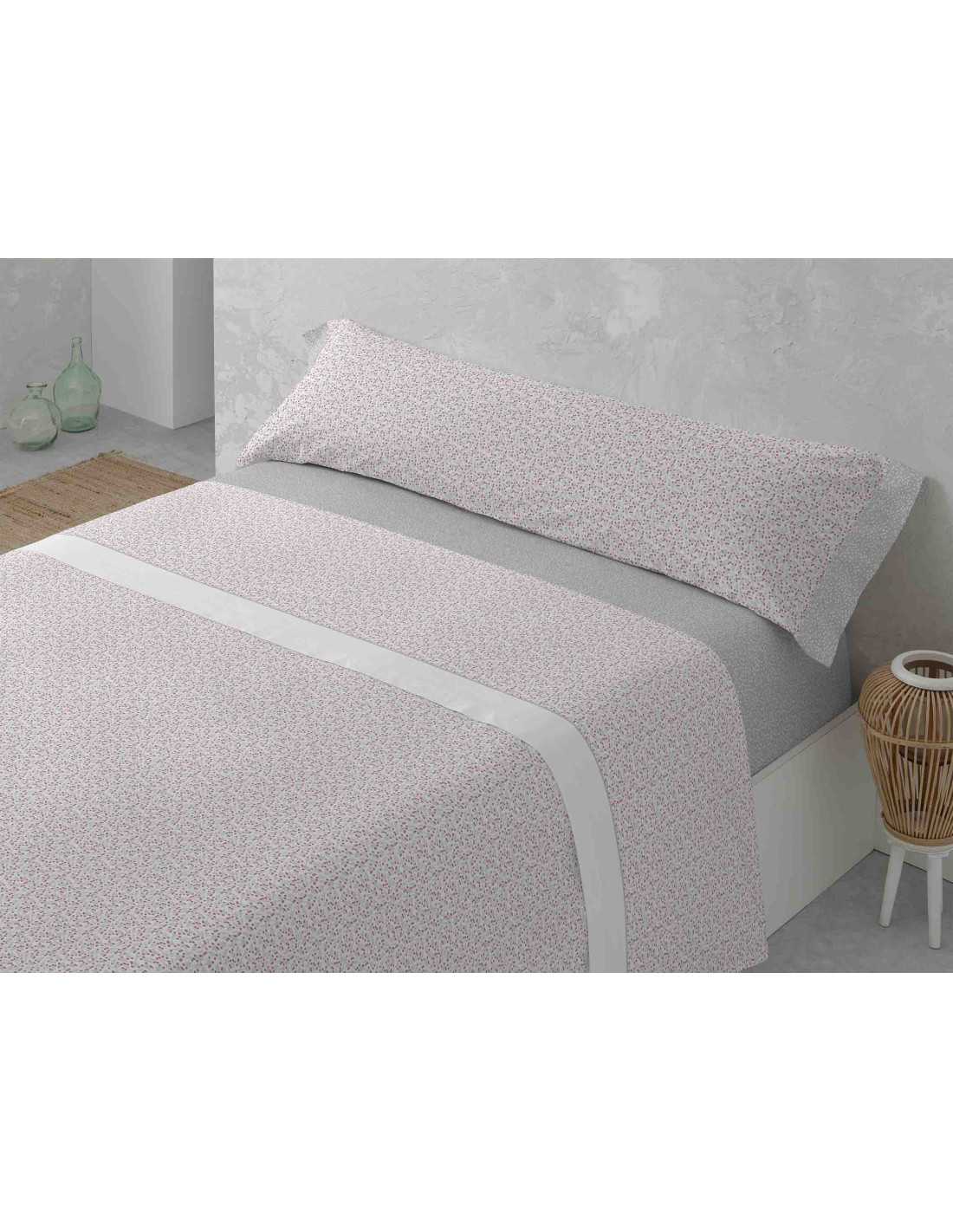Juego de sábanas de algodón y poliéster en tono rosa y gris con un adorable diseño con ramas y bayas, con cenefa blanca en la encimera y con bajera, y detalles de almohadón en color gris con topitos.