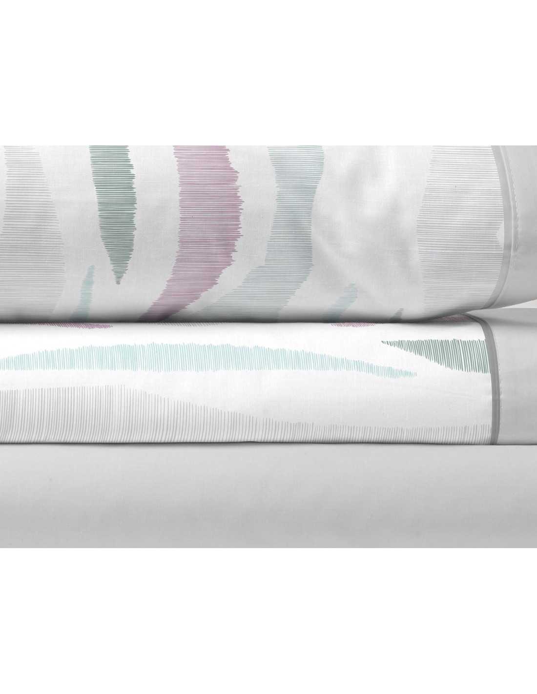 Juego de sábanas de 50% algodón - 50% poliéster con un diseño abstracto muy decorativo en tonos grises principalmente. Compuesto por 3 piezas. Ideal para entretiempo y verano.