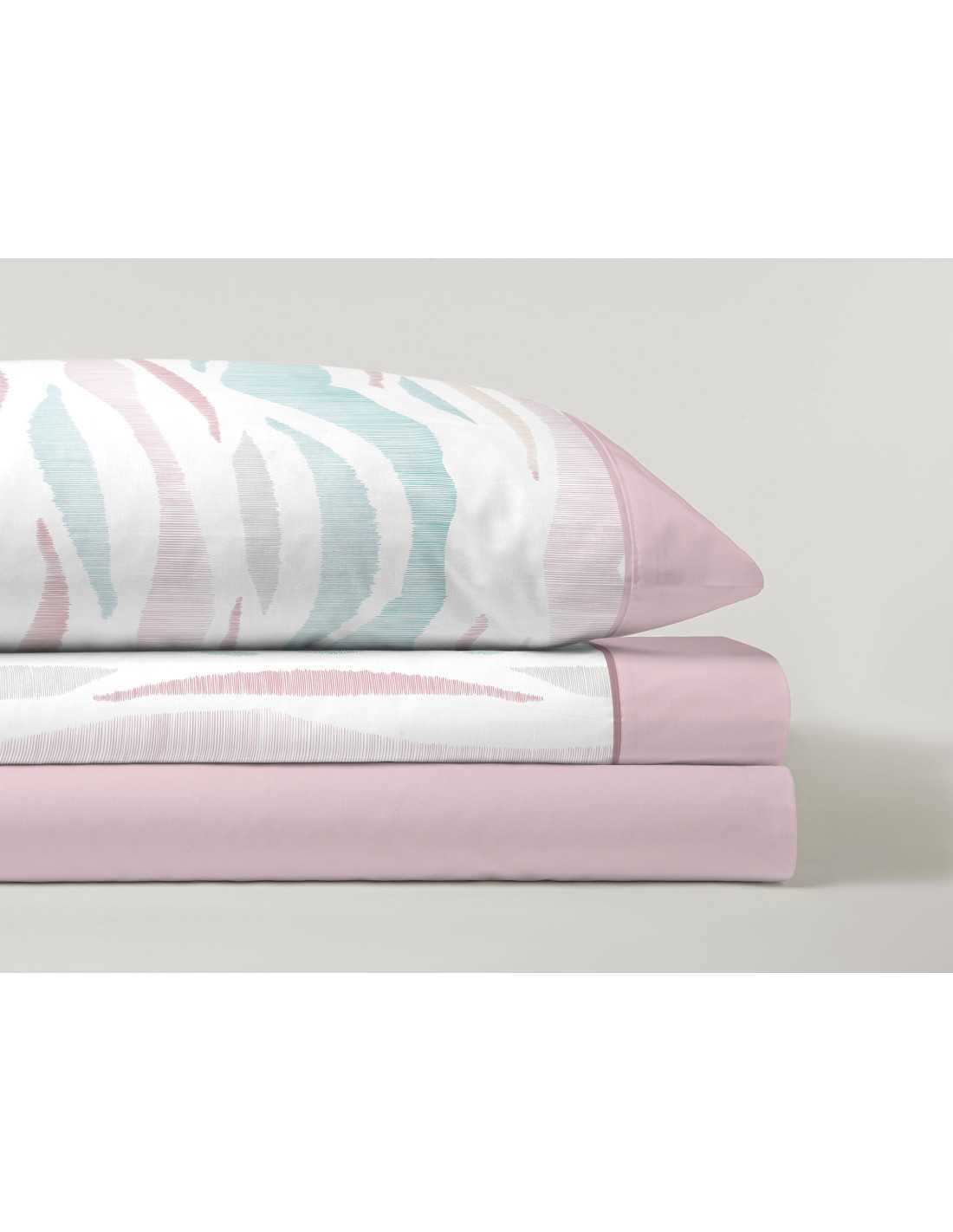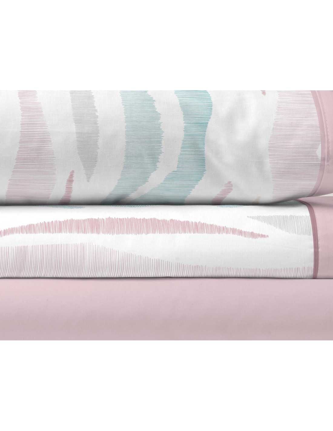 Sira es un juego de sábanas de entretiempo y verano, de 50% algodón y 50% poliéster, con un precioso diseño abstracto en tonos violeta. Tiene una tira estampada en la encimera con varias líneas con pequeños motivos geométricos.