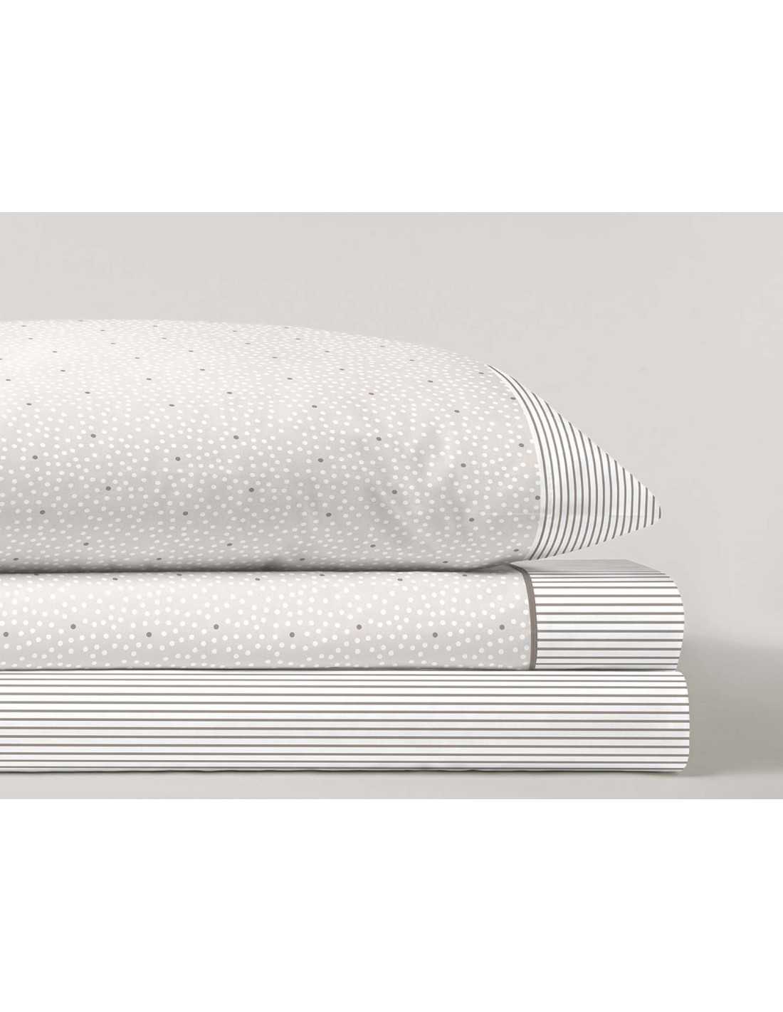 Juego de sábanas de 50% algodón - 50% poliéster con un diseño precioso diseño de puntitos y rayas en tonos beige y blancos. Compuesto por 3 piezas. Ideal para entretiempo y verano.