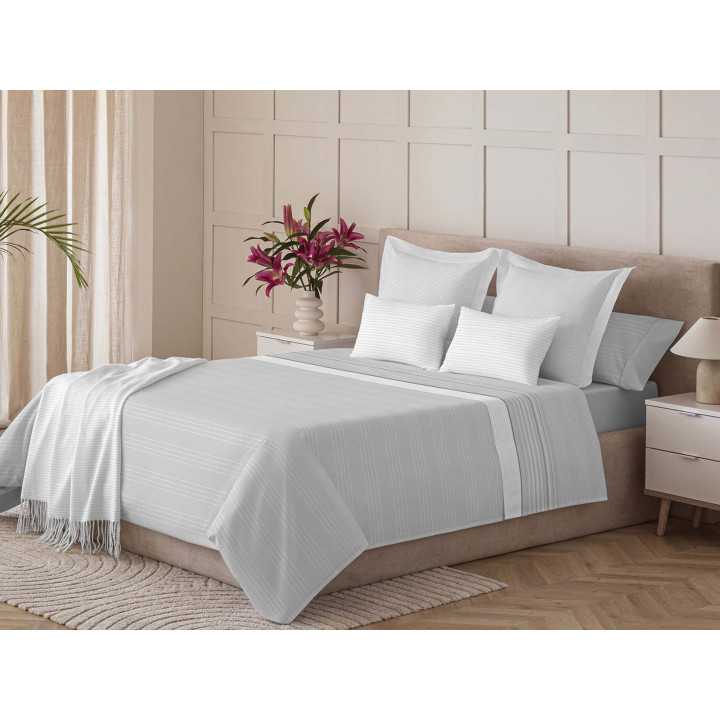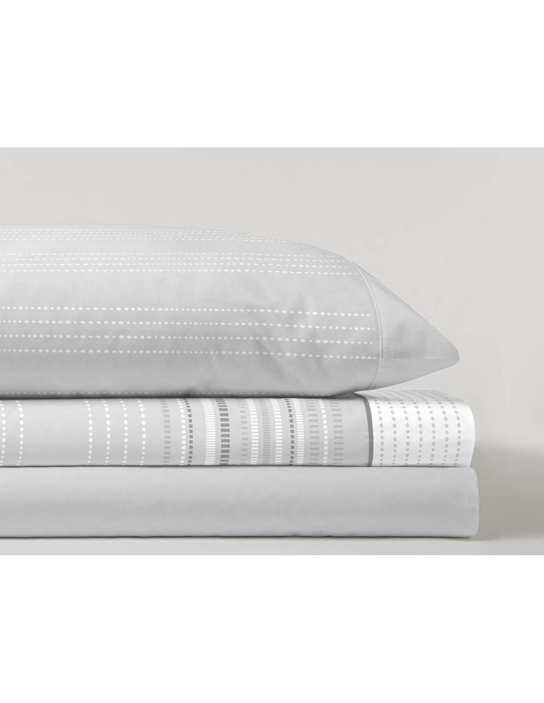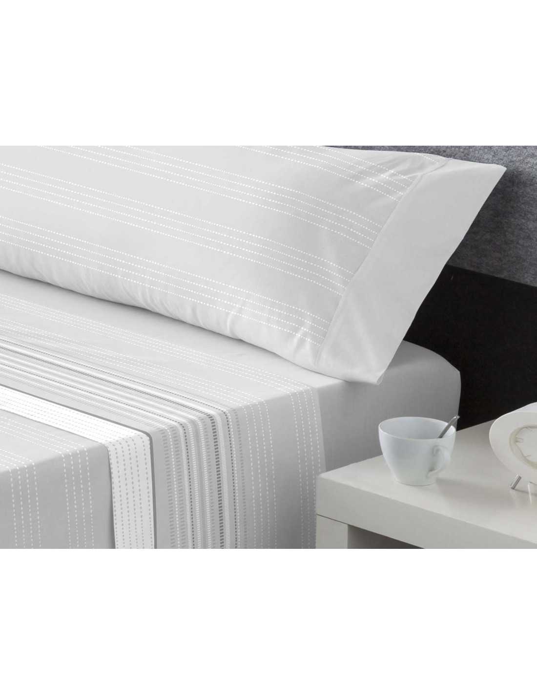 Juego de sábanas de 50% algodón - 50% poliéster con un diseño sencillo y elegante con líneas de puntos y trazos en tonos grises. Compuesto por 3 piezas. Ideal para entretiempo y verano.