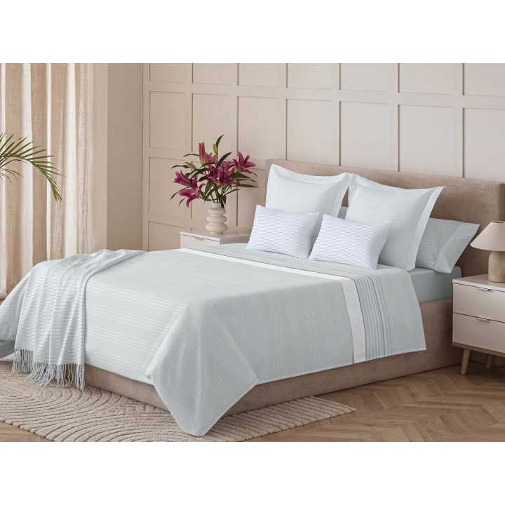 Maison es un juego de sábanas de entretiempo y verano, de 50% algodón y 50% poliéster, con un diseño muy elegante con líneas de puntos y trazos en tonos verdes. La bajera es lisa a juego y el almohadón lleva detalles lisos en los extremos.