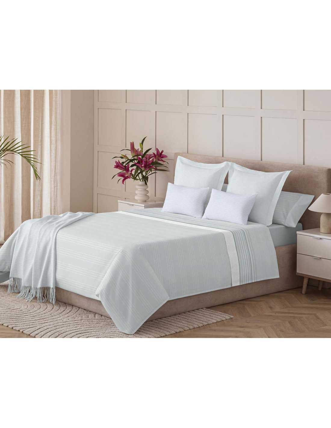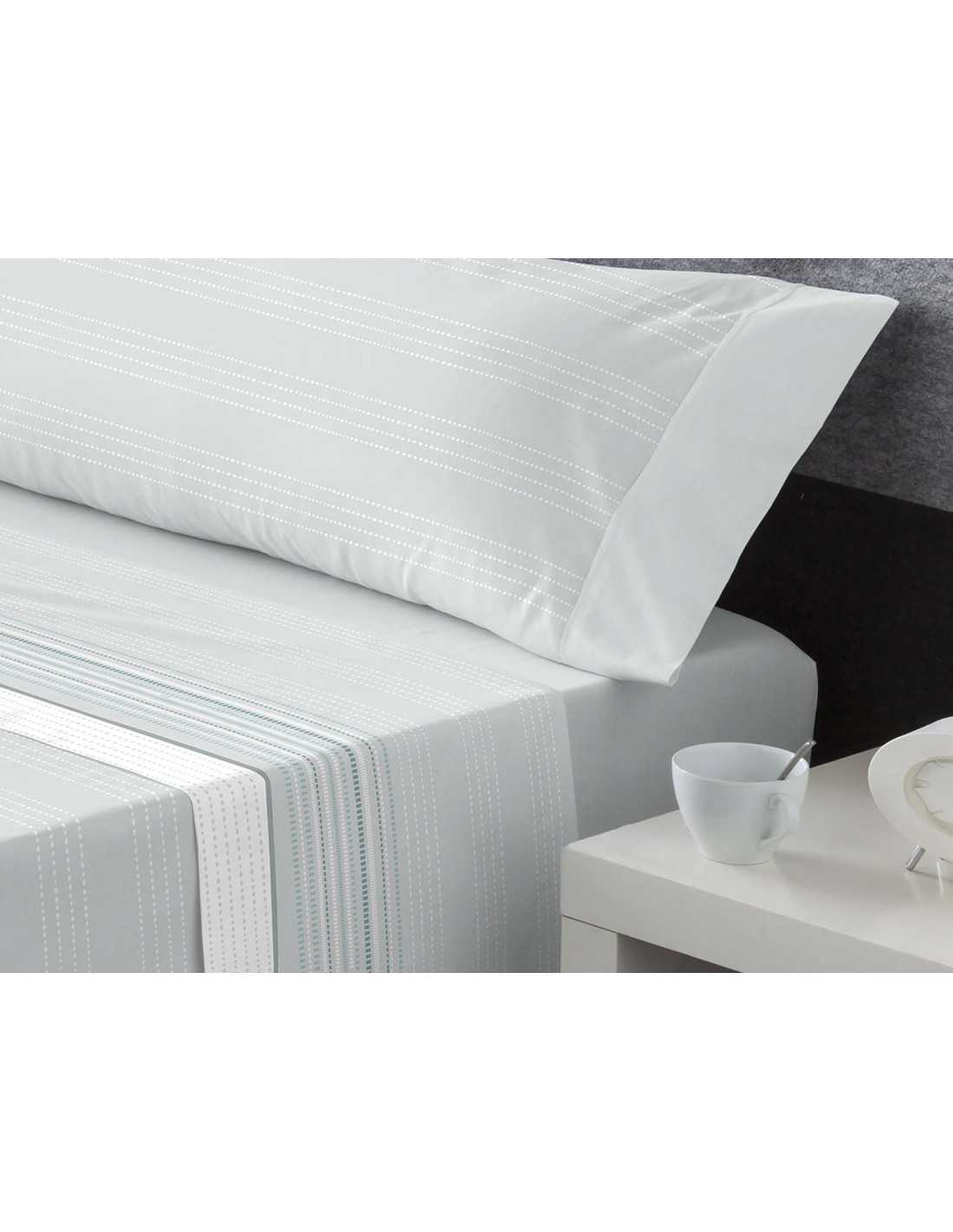Juego de sábanas de 50% algodón - 50% poliéster con un diseño sencillo y elegante con líneas de puntos y trazos en tonos verdes. Compuesto por 3 piezas. Ideal para entretiempo y verano.