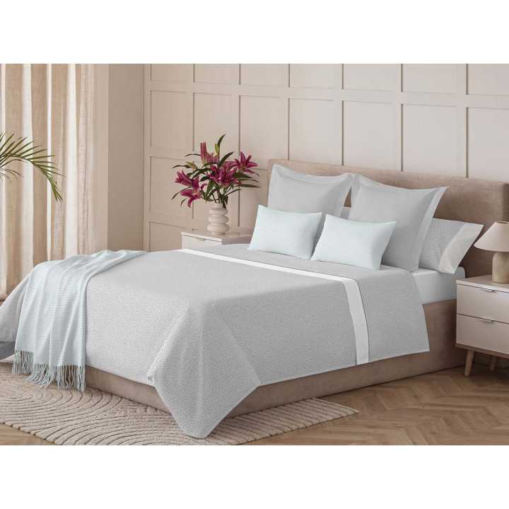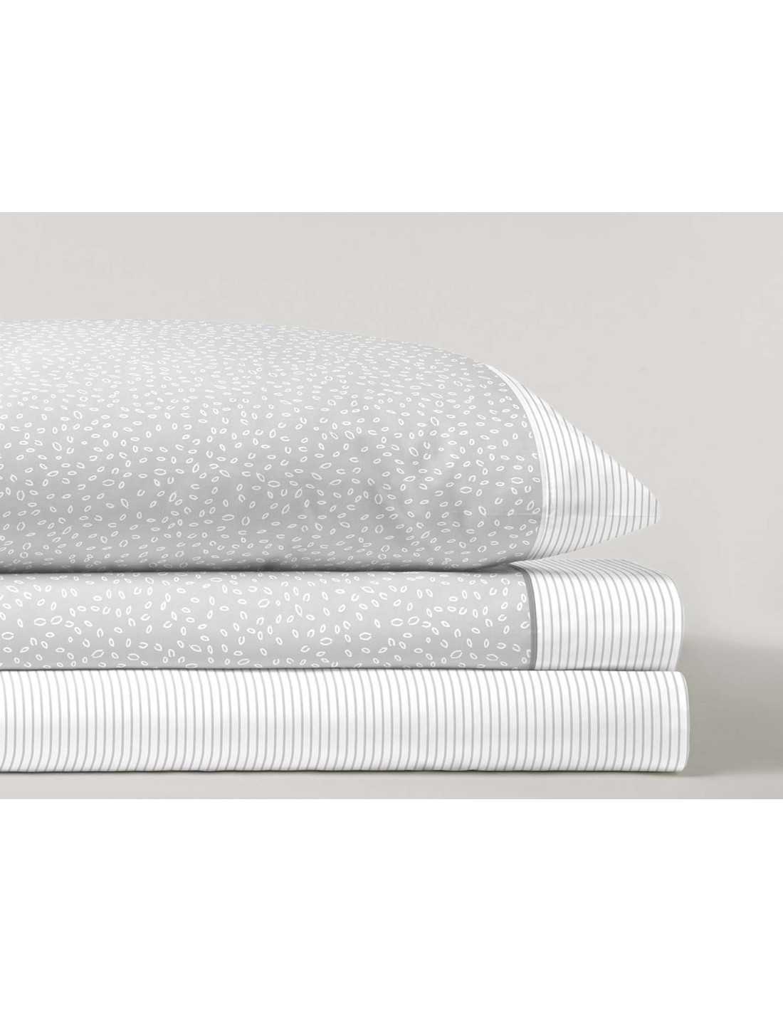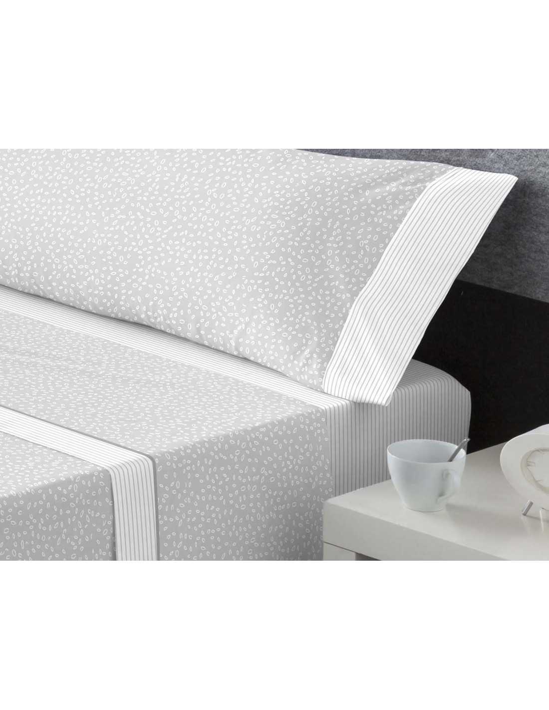 Juego de sábanas de 50% algodón - 50% poliéster con un diseño sencillo y elegante con pequeños círculos irregulares de color gris. Compuesto por 3 piezas. Ideal para entretiempo y verano.