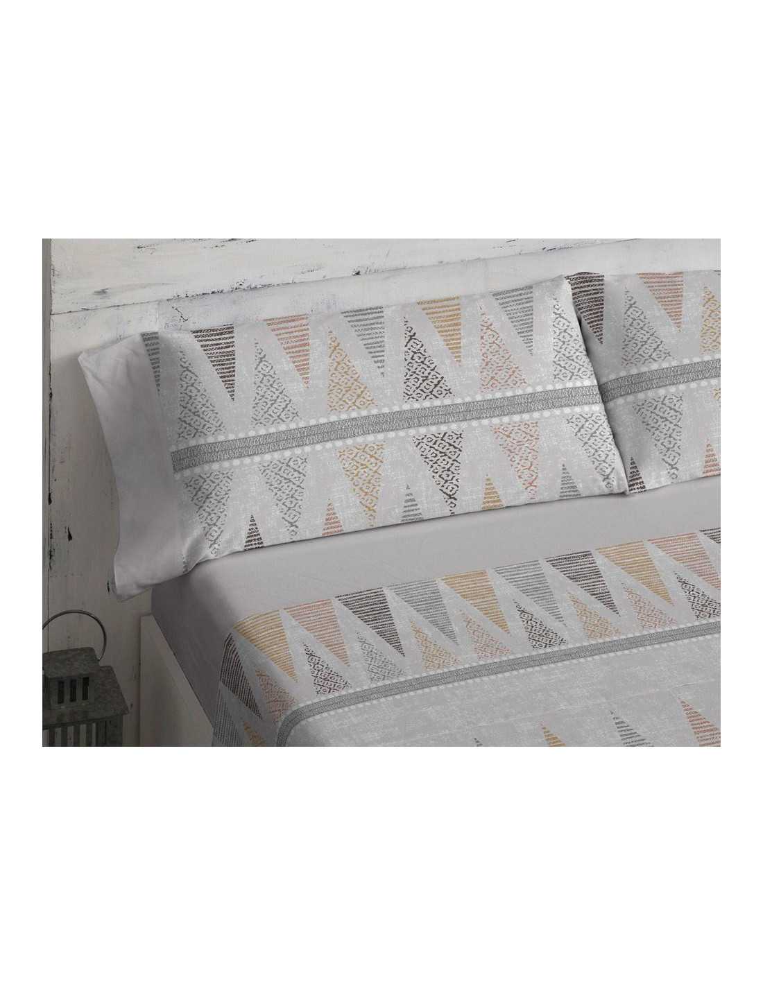 Juego de sábanas de Burrito Blanco con un bonito estampado geométrico en diversos colores.