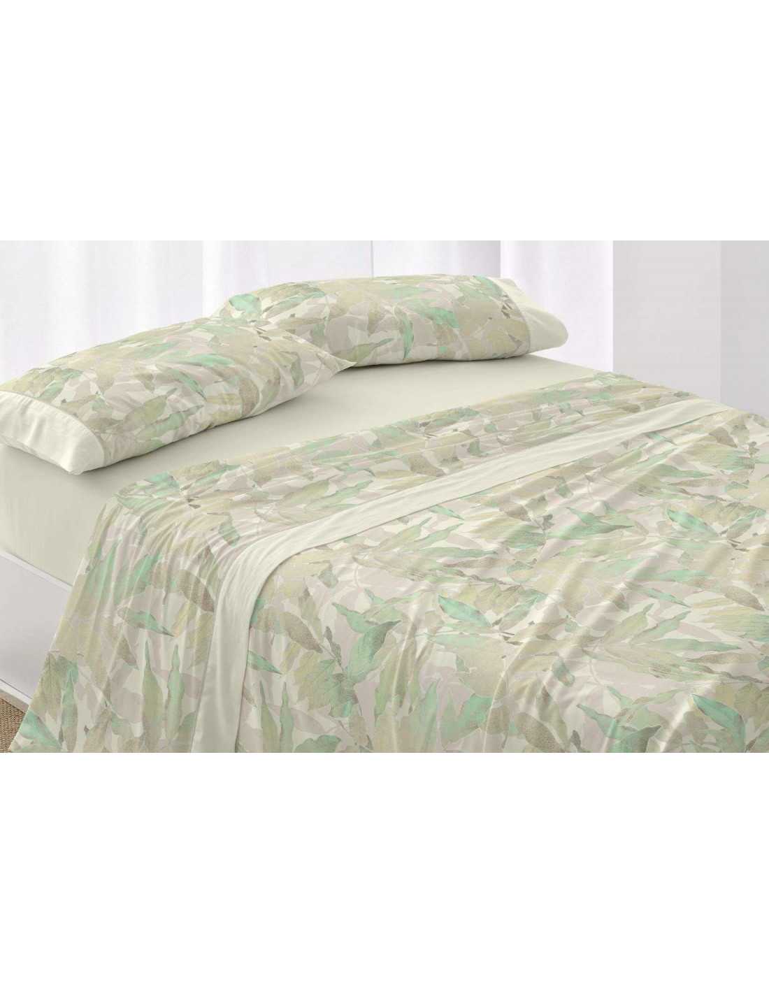 Juego de sábanas de Burrito Blanco en tonos verdes con un diseño natural con diferentes hojas confeccionada en 50% algodón y 50% poliéster para facilitar su planchado.