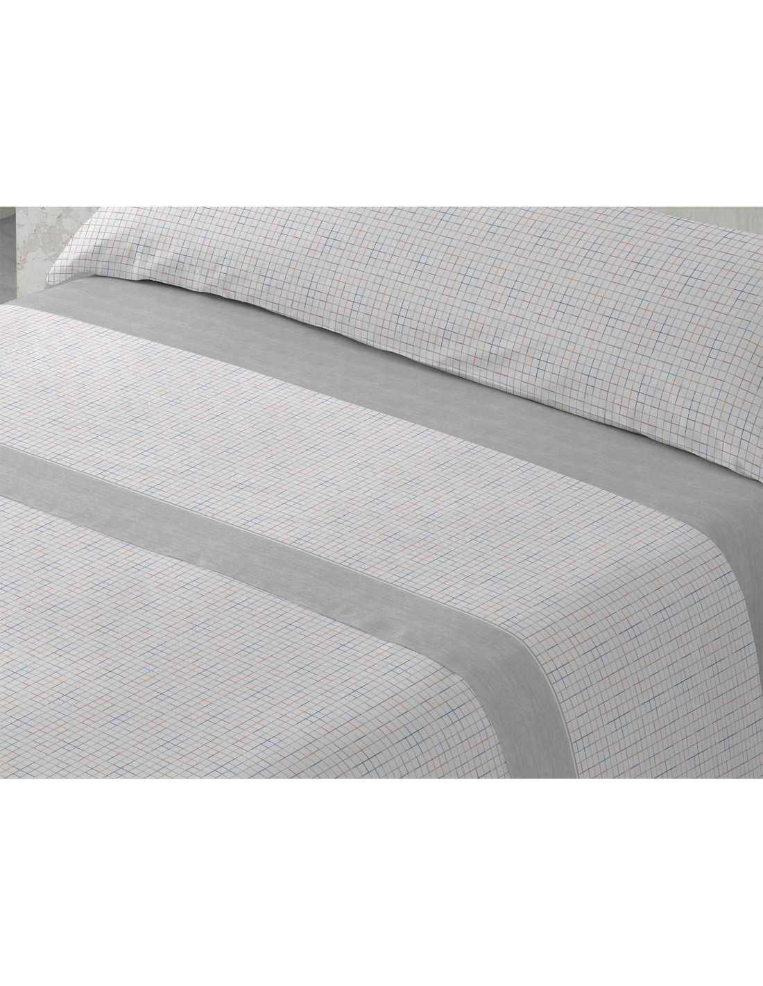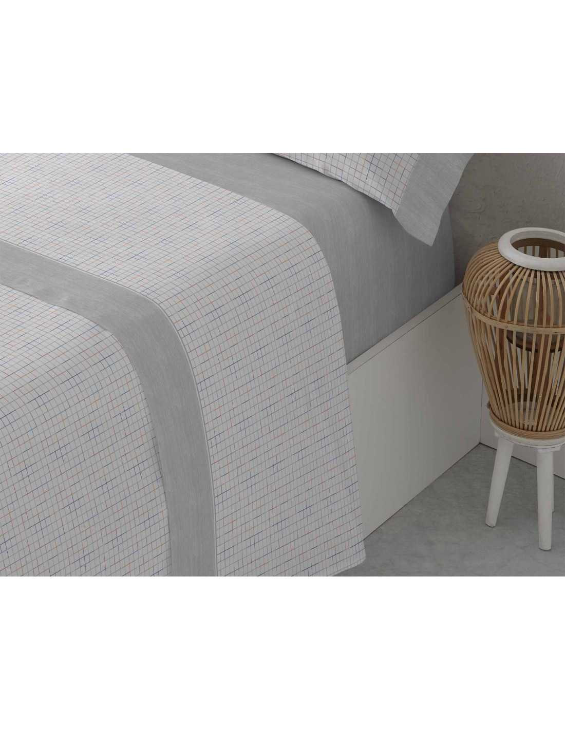 Juego de sábanas de algodón y poliéster en tonos grises con un sencillo y elegante diseño de cuadros combinado con la bajera lisa jaspaeada a juego, detalle en la encimera y extremos del almohadón en color liso.