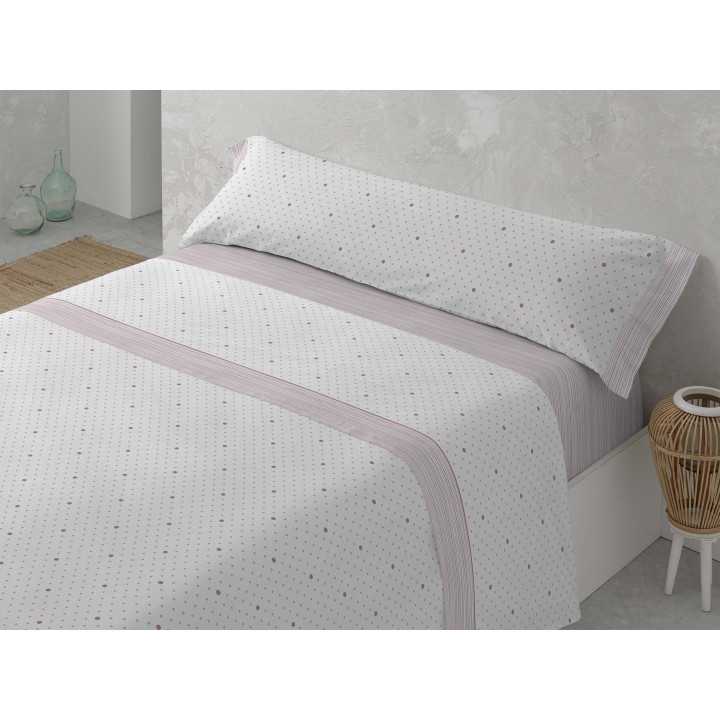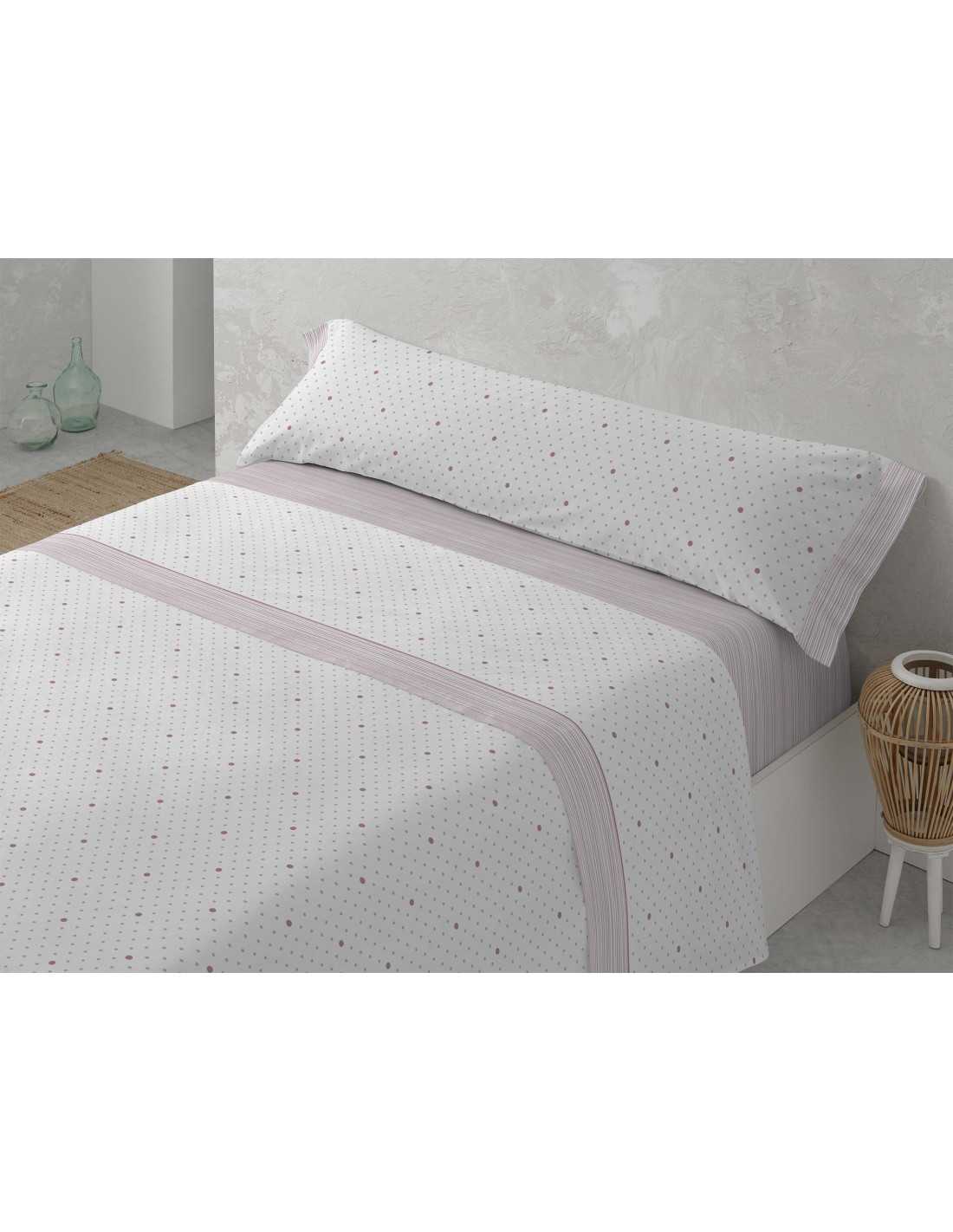 Raisa es un juego de sábanas con un diseño decorativo con puntitos en tonos rosa, con la bajera con líneas finas y detalles en la cenefa de la encimera y extremos del almohadón. Juego de sábanas con mucho estilo para decorar tu cama y a un precio fantástico.