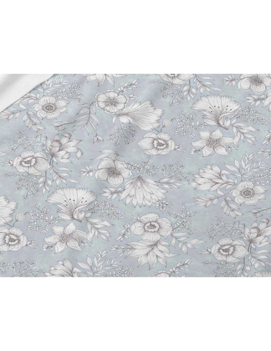 El juego de sábanas Atmos de Burrito Blanco en color agua es un juego 100% algodón, con un estampado clásico con diseño floral estilo toile de Jouy, con la bajera, y detalles de la encimera y almohadón en color gris claro.