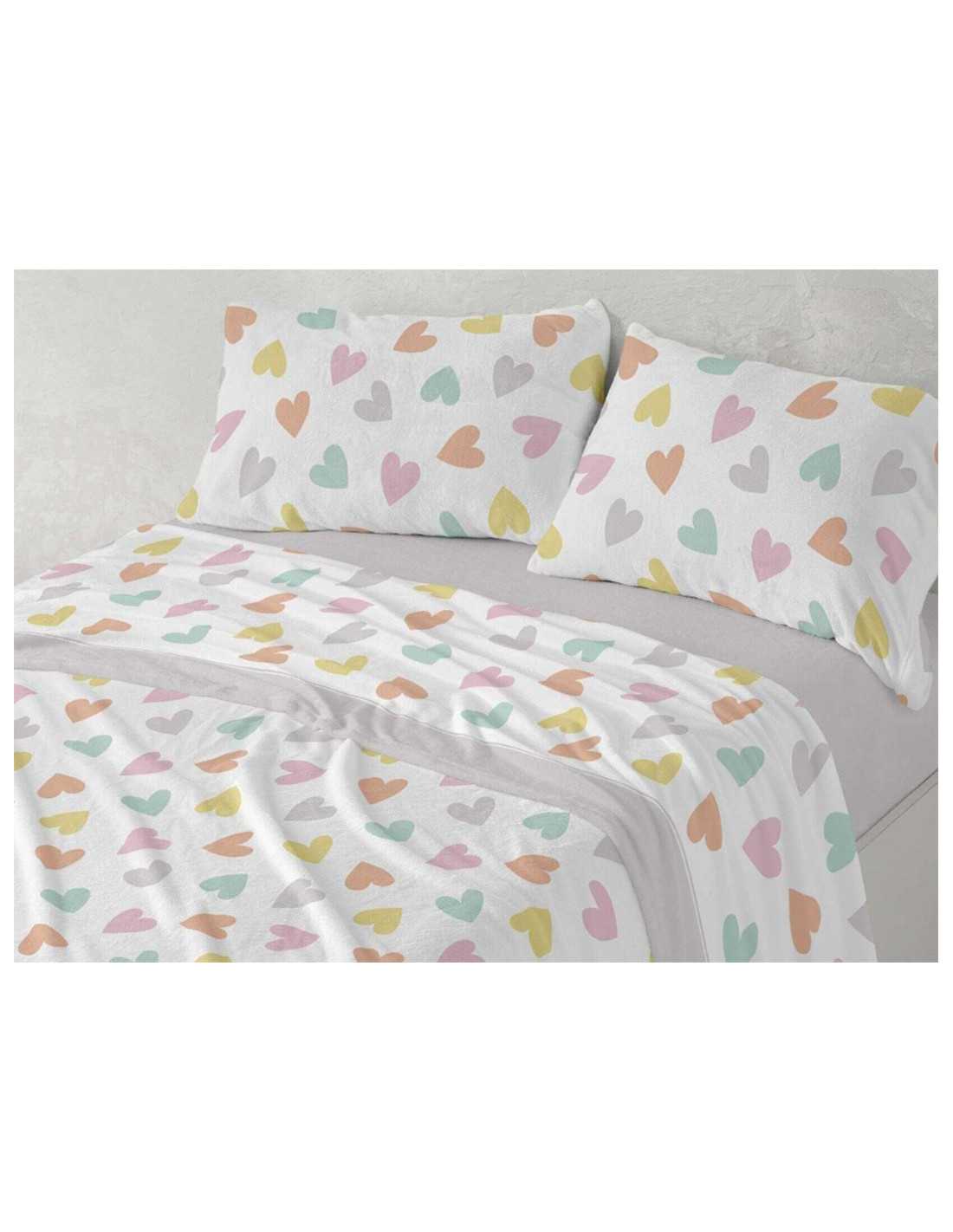Juego de sábanas Burrito Blanco de coralina con un diseño fresco y divertido con corazones de varios colores. Muy cálidas y suaves.