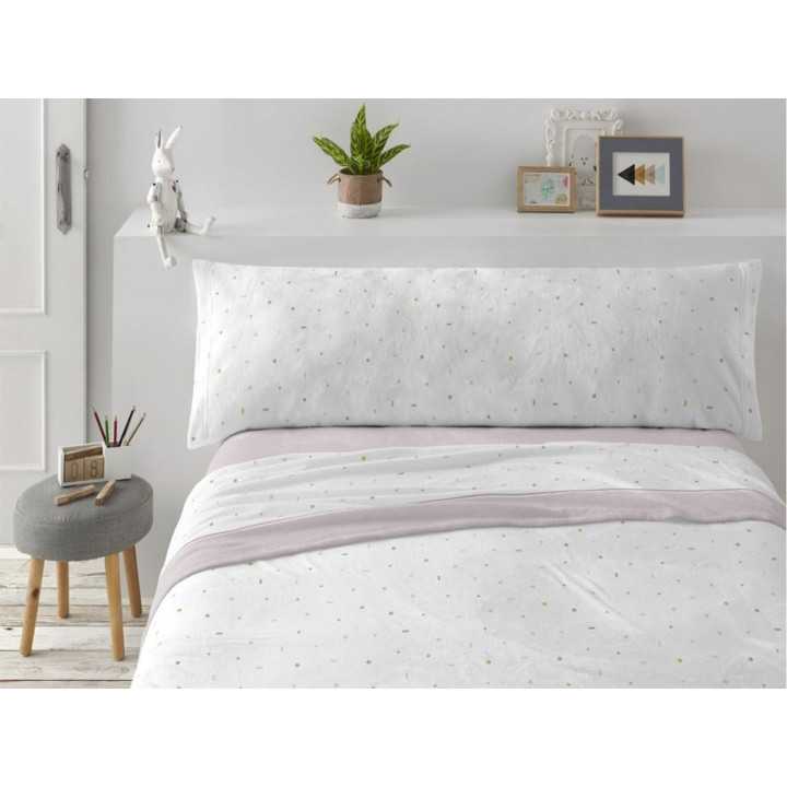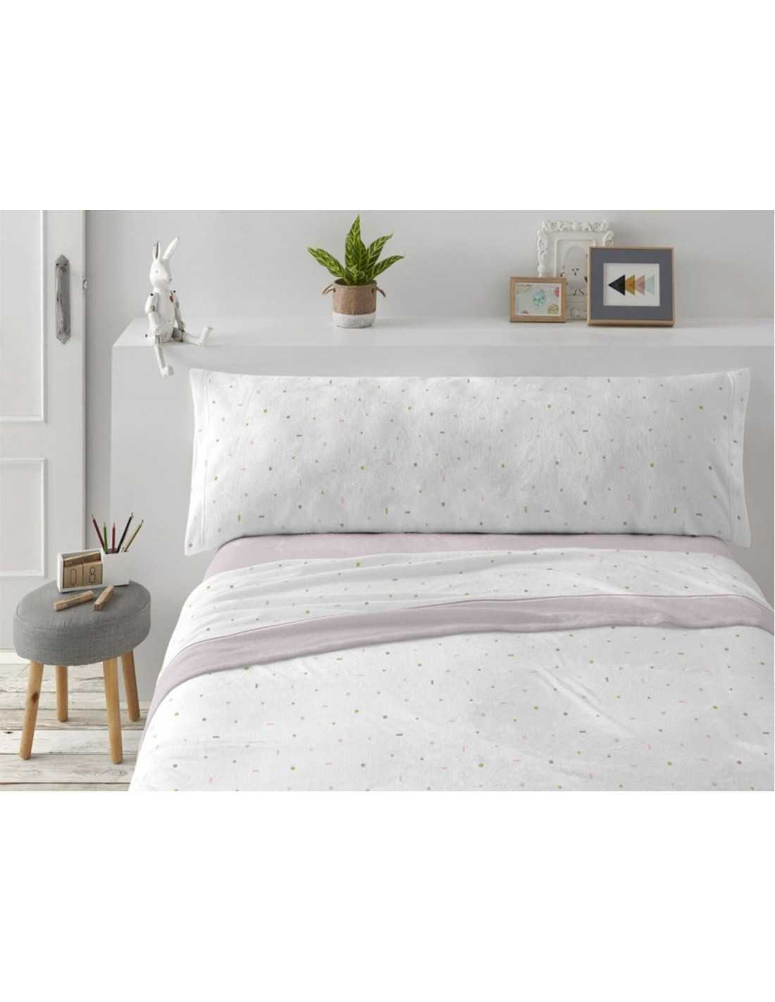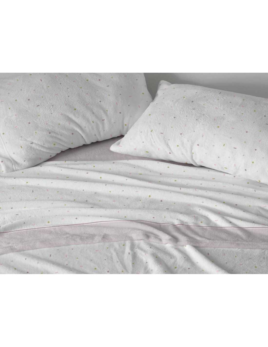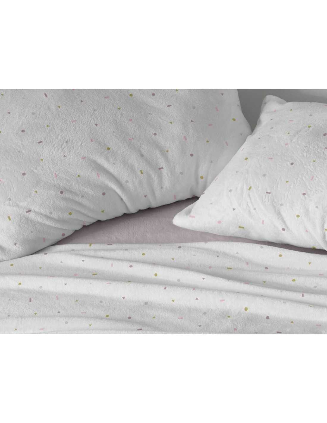Juego de sábanas Burrito Blanco de Coralina, con diseño sencillo con topitos. Sábana de gran calidez y tacto extra suave ideal para los meses de invierno más fríos.