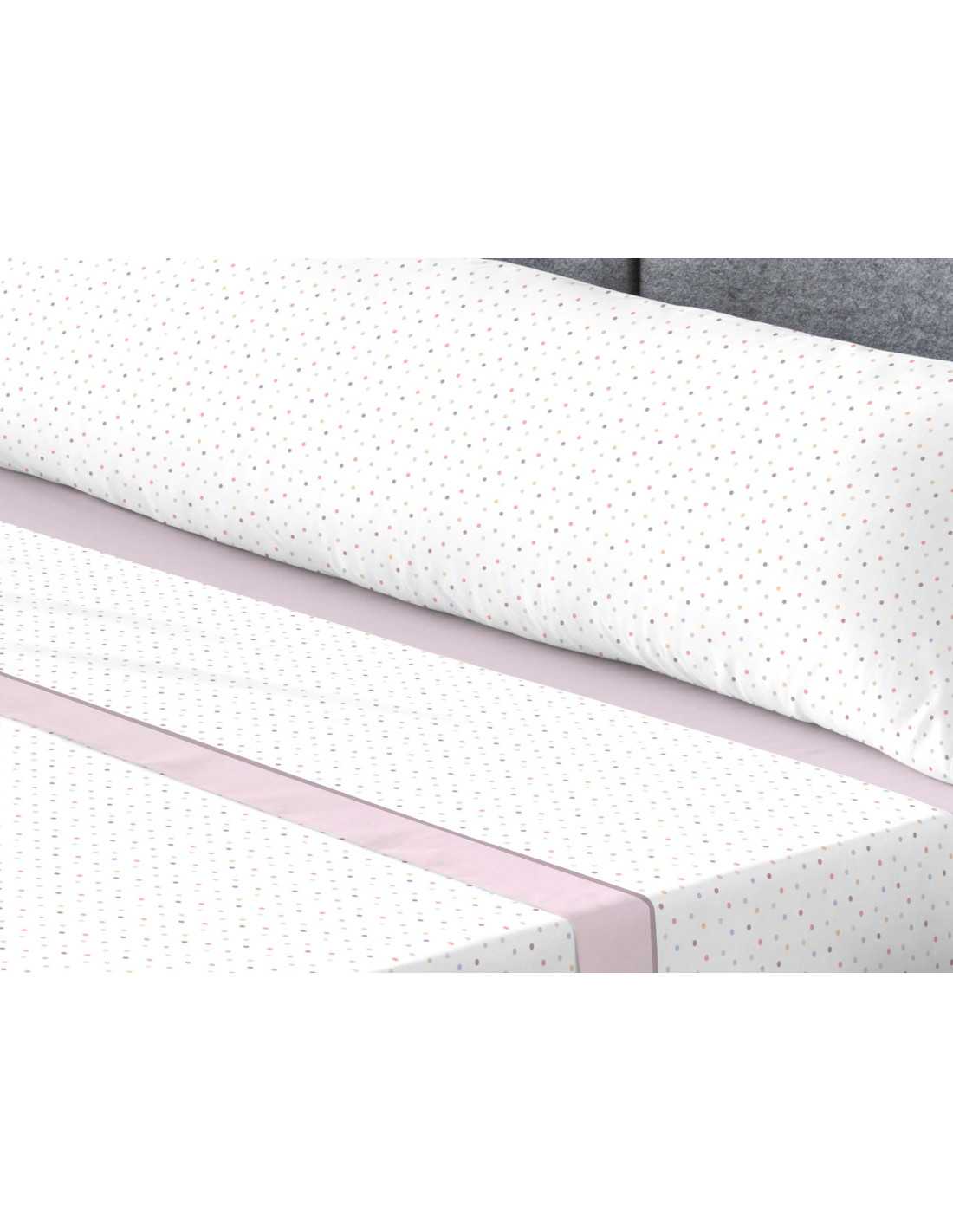 Reidar es un juego de sábanas de coralina con un sencillo diseño de topitos en varios colores, con bajera y cenefa de la encimera en color rosa. Tiene un tacto ultra suave para un placentero descanso.