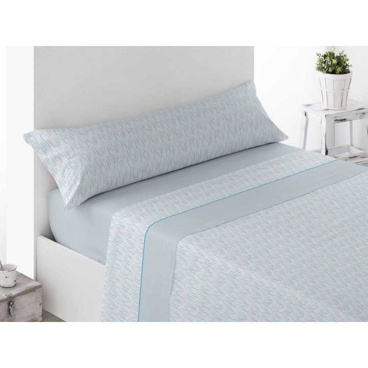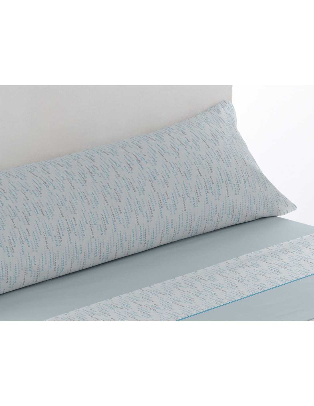 Juego de sábanas térmicas con un diseño de trazos con pequeños triángulos en color azul, muy suaves y ligeras. Las sábanas polares perfectas para el invierno.