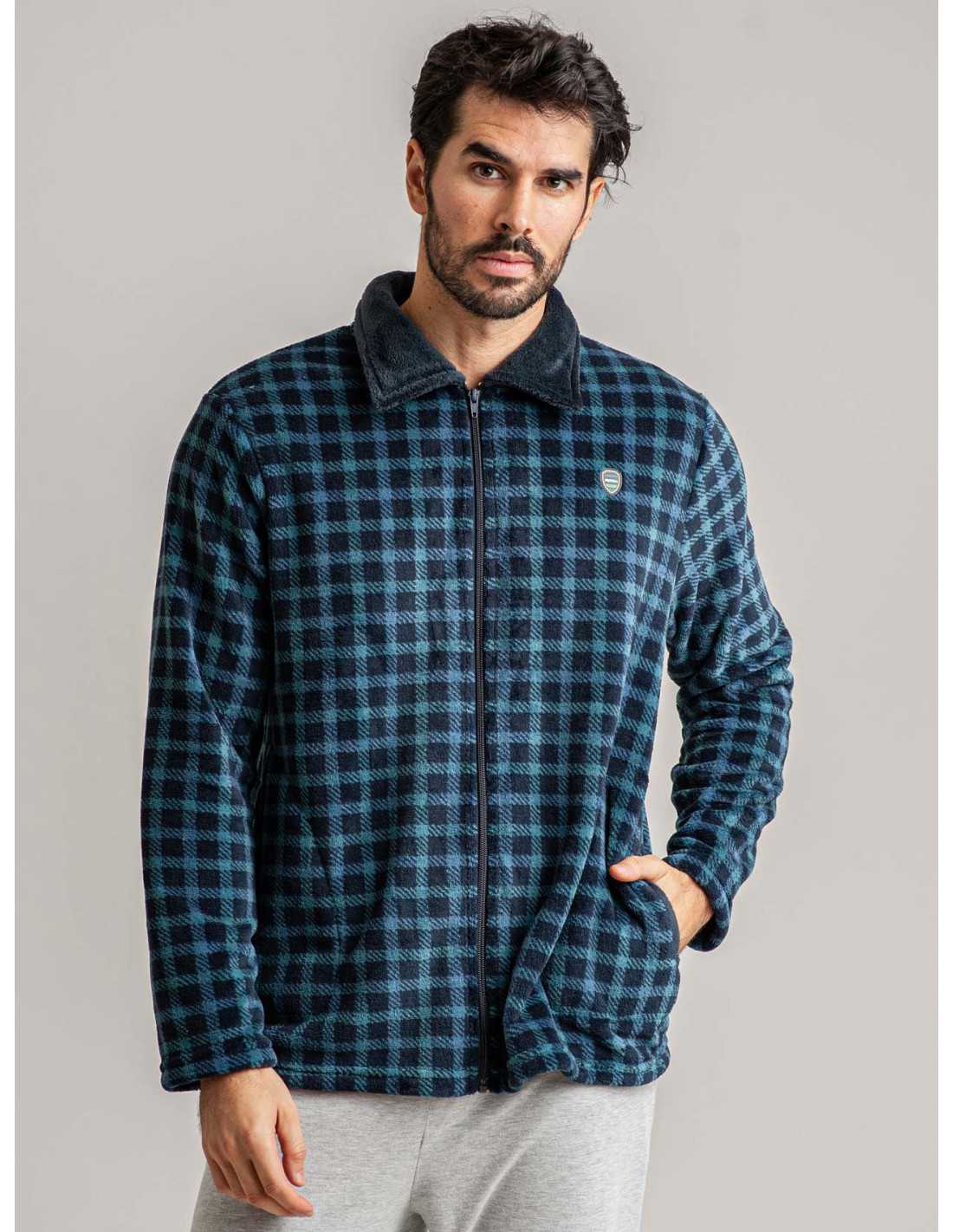 Bata de hombre de coralina, por lo que resulta muy cálida y de tacto sedoso. Una bonita bata en color azul con estampado de cuadros con bolsillos y cremallera. No dejes pasar la oportunidad de disfrutar de tus momentos de relax en casa con nuestras batas y pijamas.