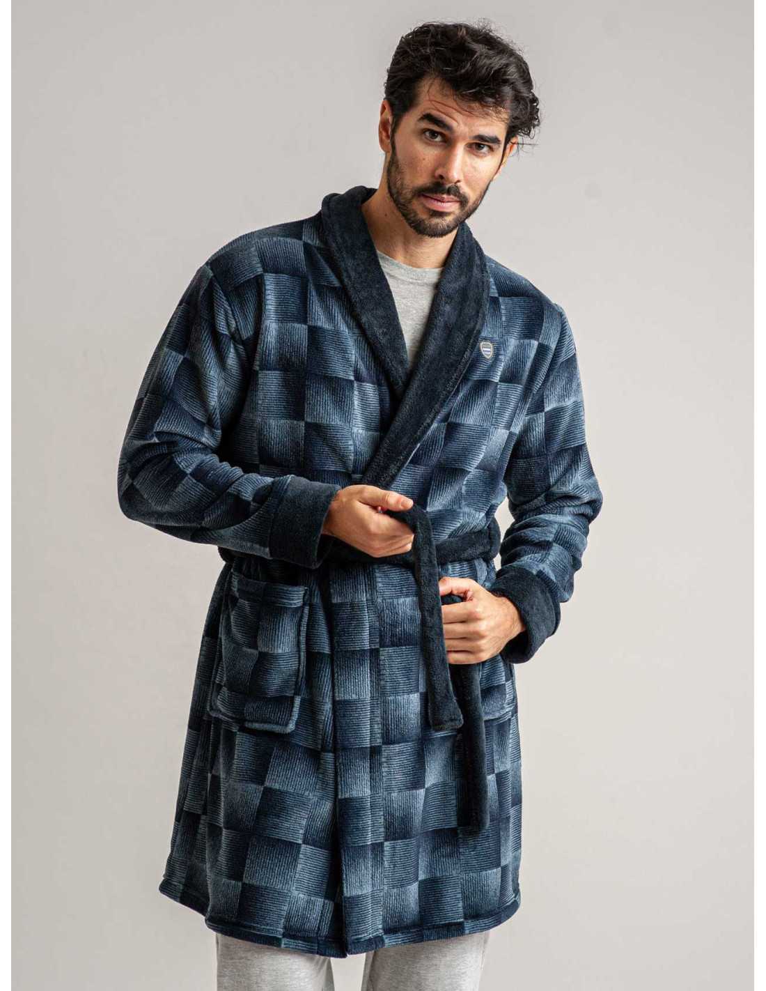 Bata de hombre de coralina, por lo que resulta muy cálida y de tacto sedoso. Una bonita bata en color azul con estampado de cuadros con bolsillos y cinturón. No dejes pasar la oportunidad de disfrutar de tus momentos de relax en casa con nuestras batas y pijamas.
