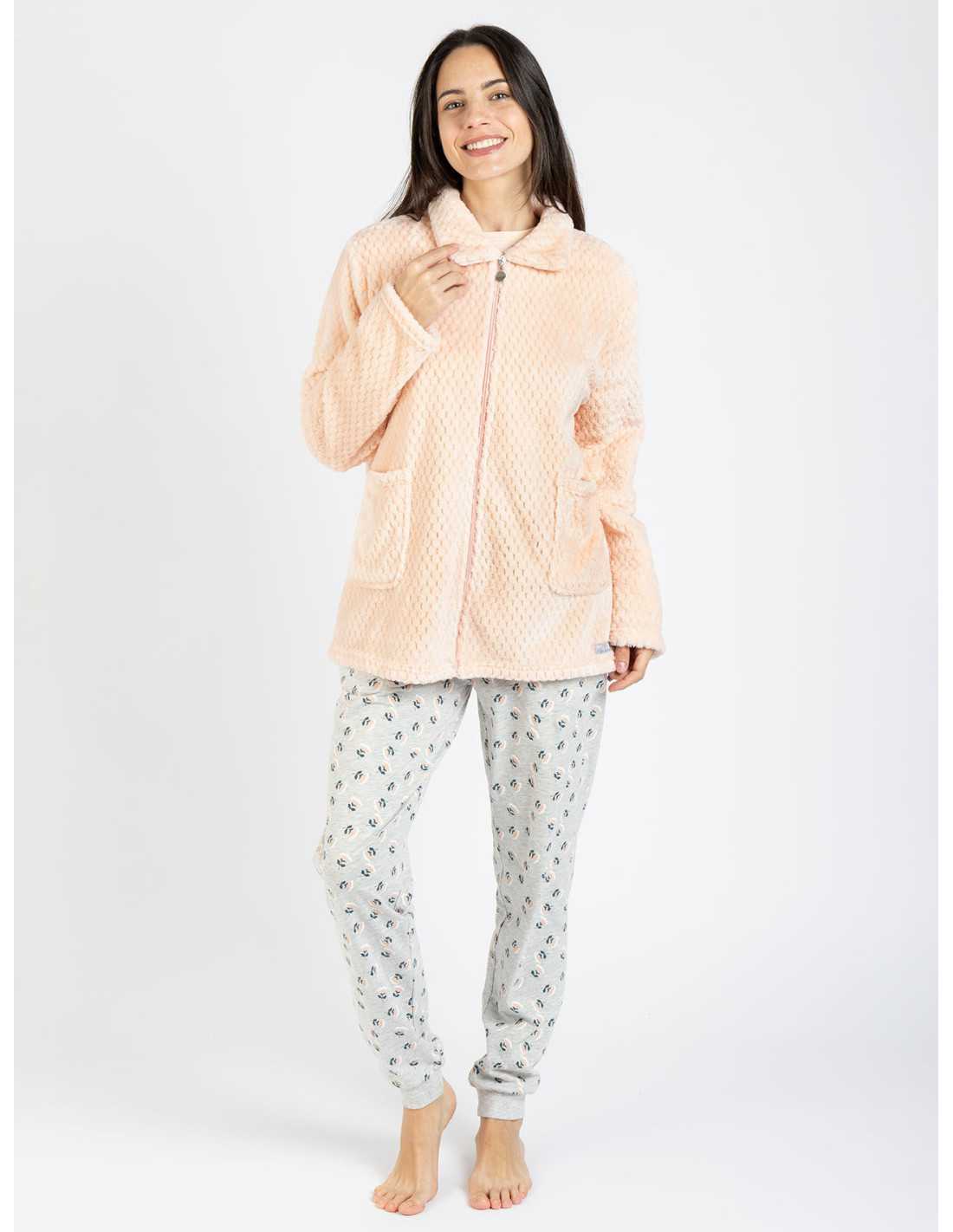 La bata Kelda está confeccionada en tejido coralina, muy suave y cálido, ideal para el invierno. Tiene un diseño en color salmón y cuenta con cremallera y bolsillos.