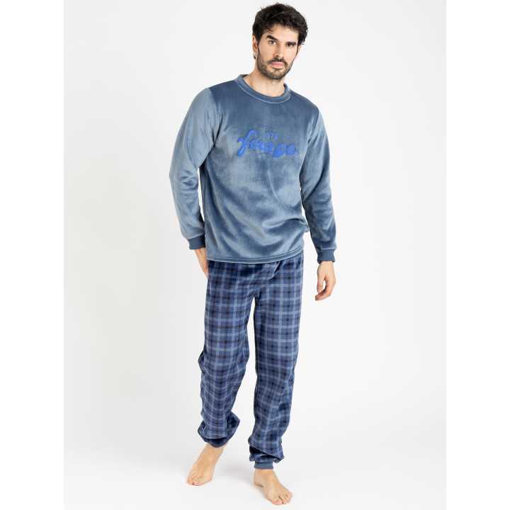 El pijama Viggo está confeccionado en tejido Supersoft, un nuevo tejido de tacto extra suave y cálido, ideal para el invierno. La parte de arriba es gris azulado con un texto bordado con cuello redondo, el pantalón es azul con cuadros con puño, con goma y cordón en la cintura.