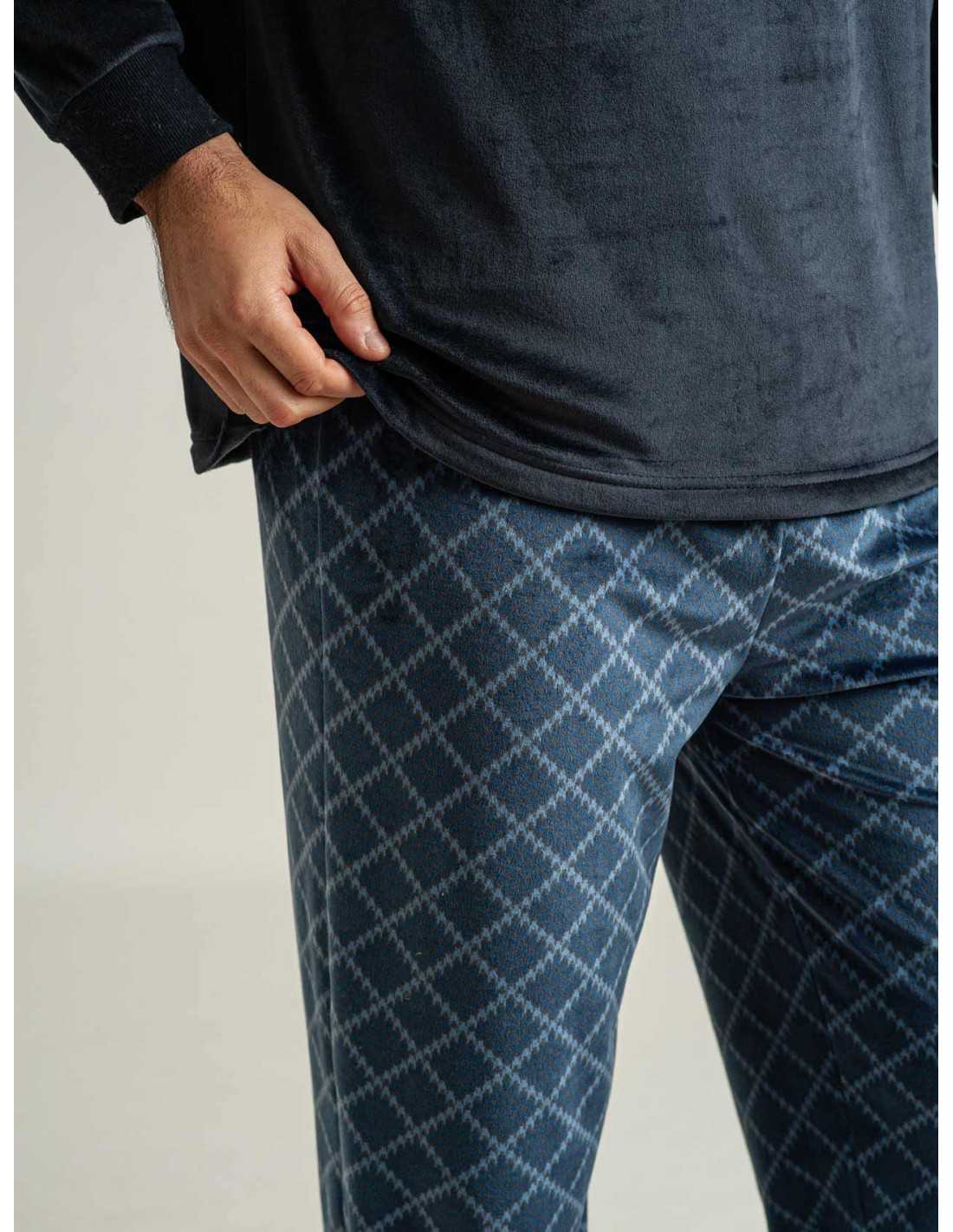 Pijama en tejido de terciopelo y suave al tacto. Un pijama muy cálido y calentito la parte de arriba es lisa en color azul y el pantalón tiene un estampado de cuadros con puño y goma con cordón. No dejes pasar la oportunidad de disfrutar de tus momentos de relax en casa con nuestros pijamas.