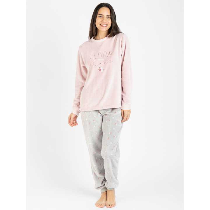 El pijama Tyra está confeccionado en tejido coralina, de gran calidez ideal para el invierno. La parte de arriba es rosa con un bonito bordado y el pantalón es gris con motivos florales, con puño, con goma y cordón en la cintura. Disfruta de tu ocio y tu descanso en tu hogar con nuestros pijamas.