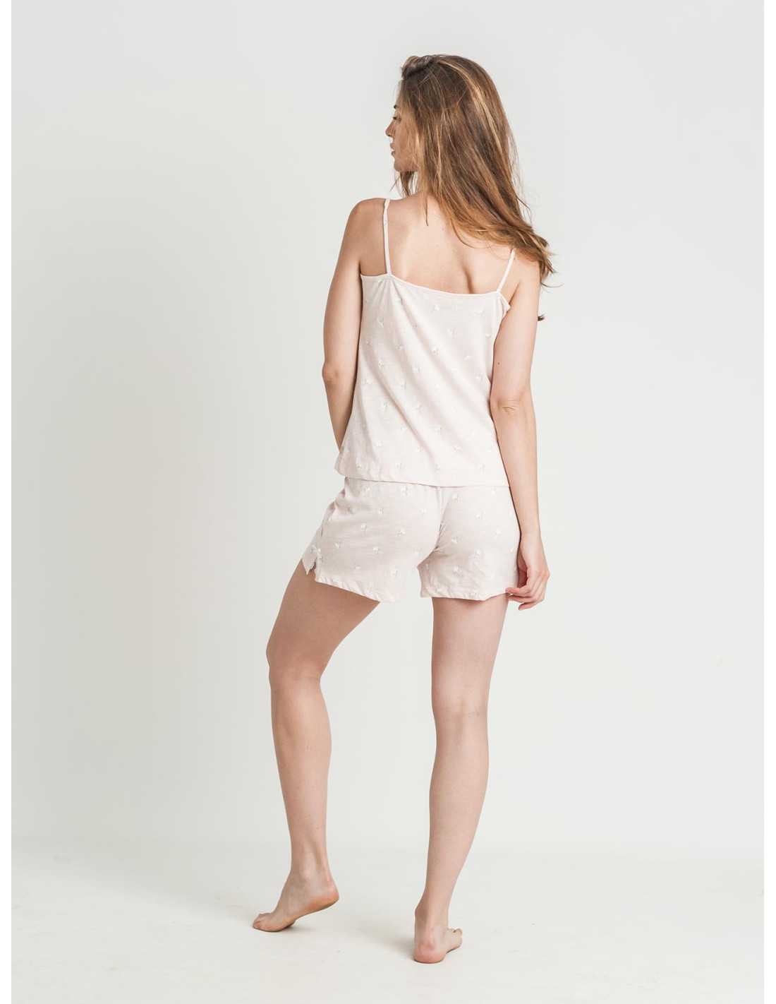 El modelo Algodón es un cómodo pijama compuesto de parte de arriba con tirantes, botones y puntilla en color rosa jaspeado y con estampado en blanco de la flor del algodón, la parte de abajo es un bonito pantalón corto a conjunto con cintura ajustable y dos originles aberturas a cada lado del pantalón corto con lacitos y puntilla.