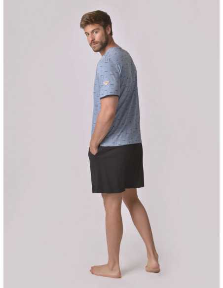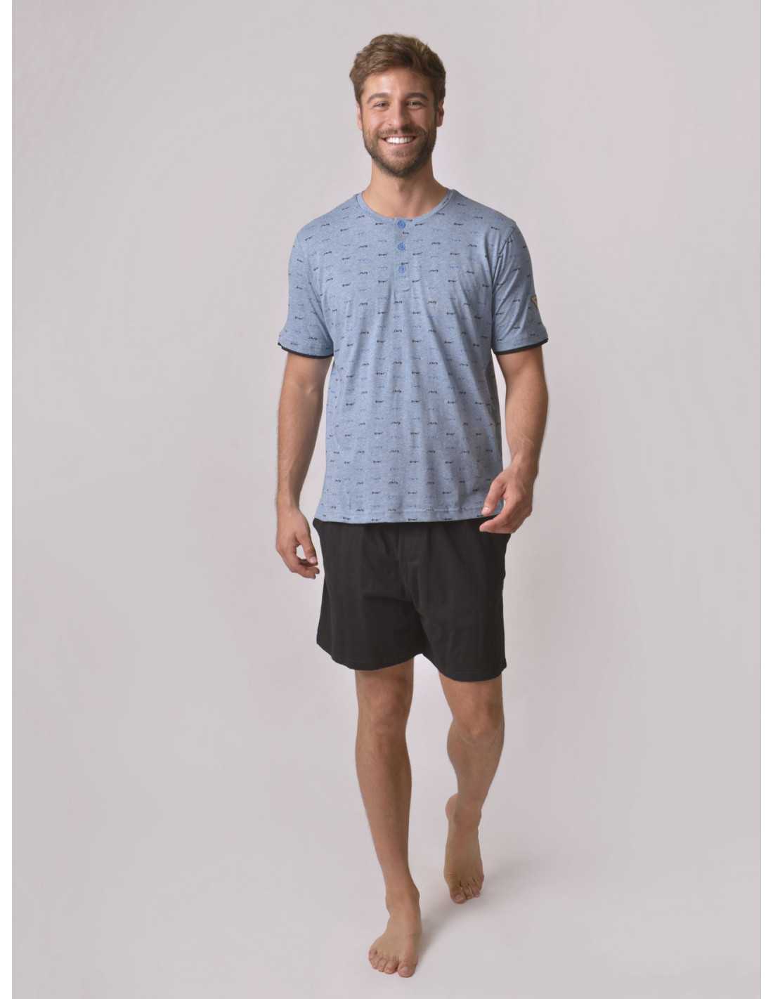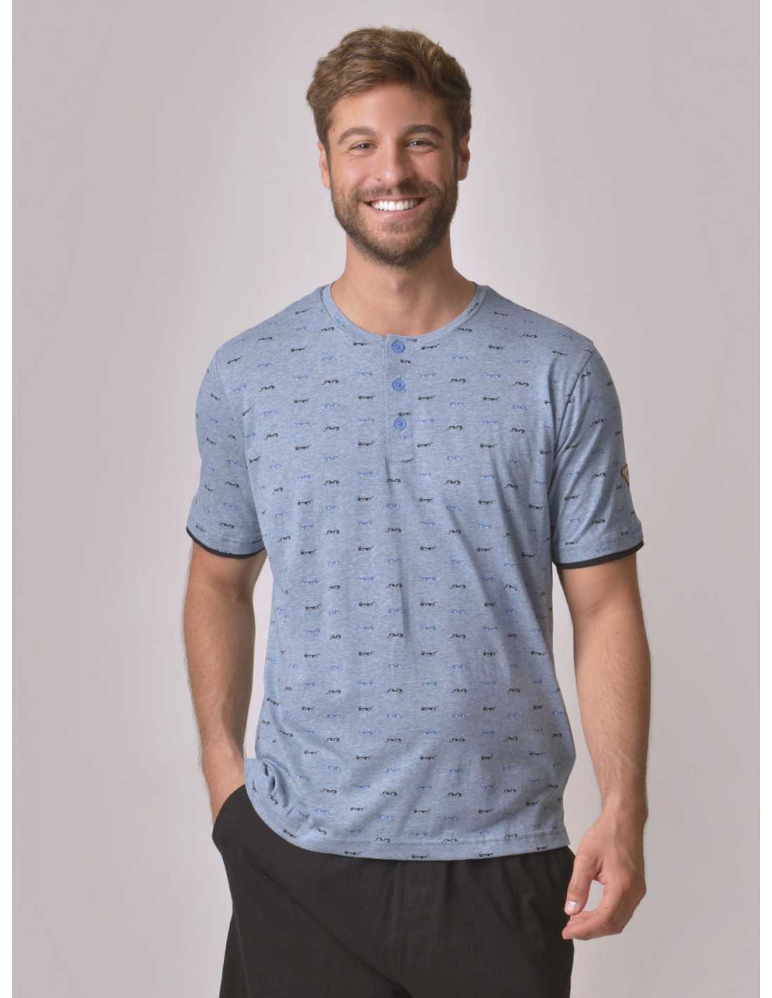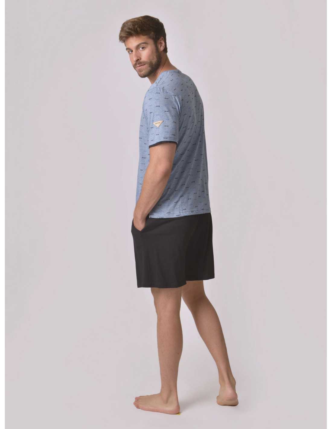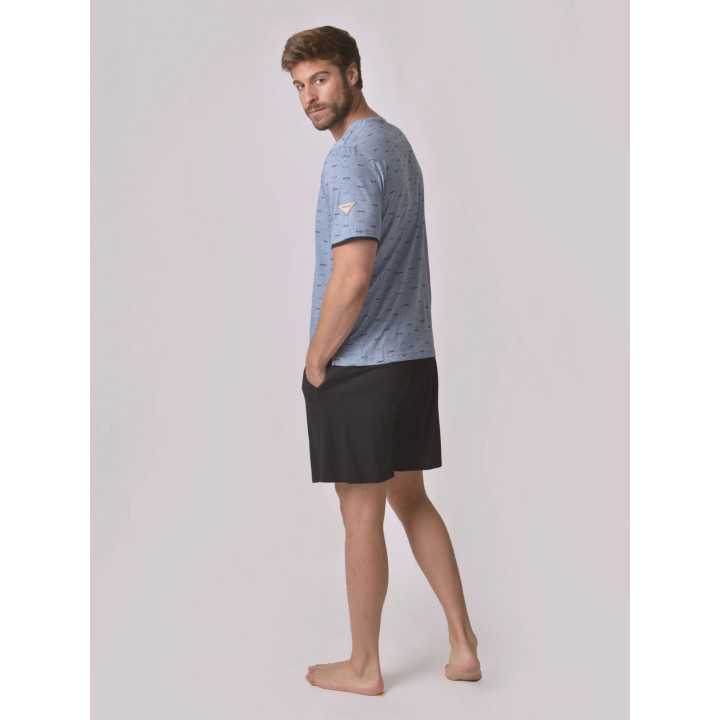 El modelo Puka es un cómodo pijama compuesto de camiseta manga corta de punto jaspeado color azul, cuello redondo con botones a tono de la prenda, con original estampado de gafas de sol y efecto doble manga en punto liso negro. Pantalón corto de punto liso color negro con cordón ajustable y bolsillo a contraste.