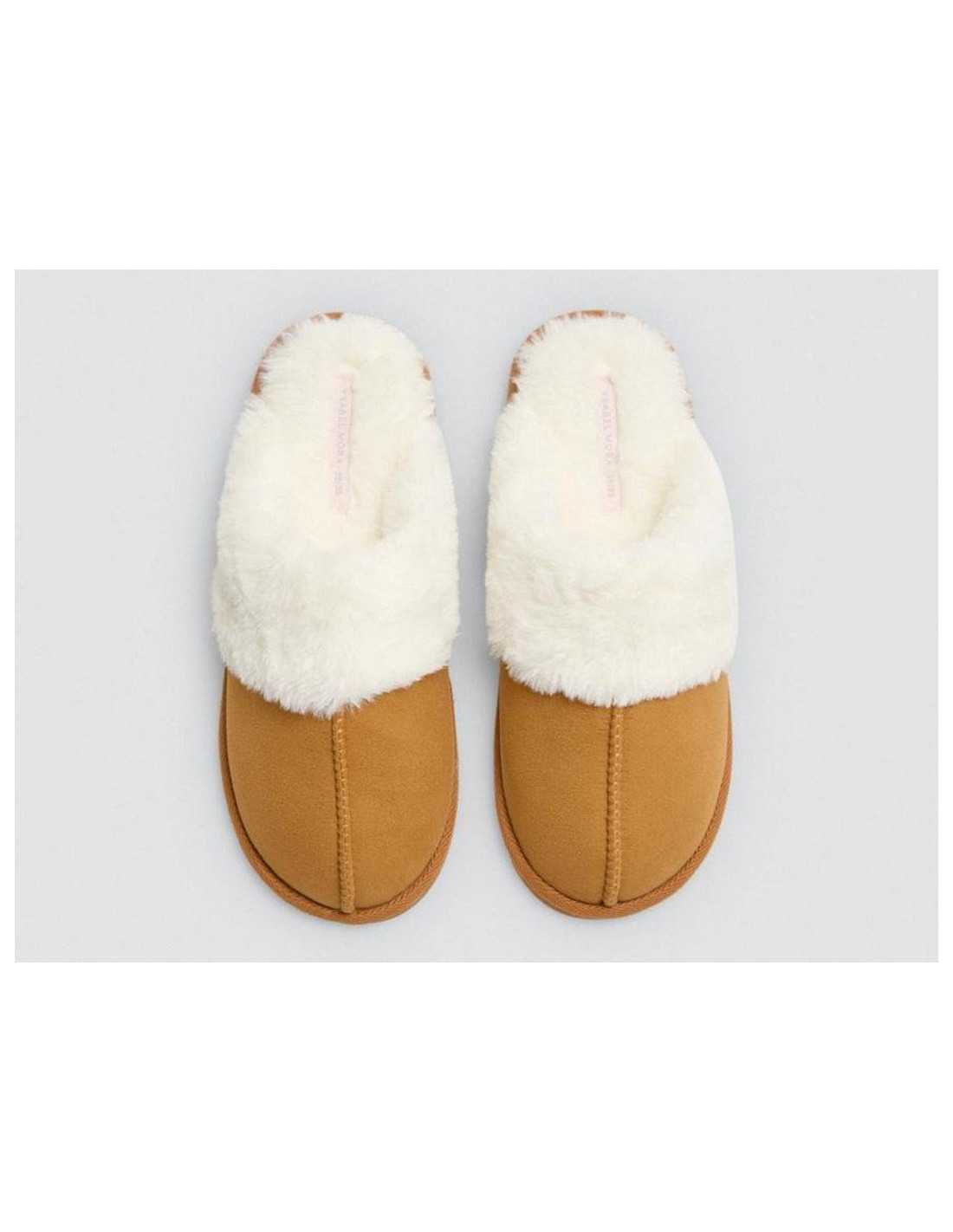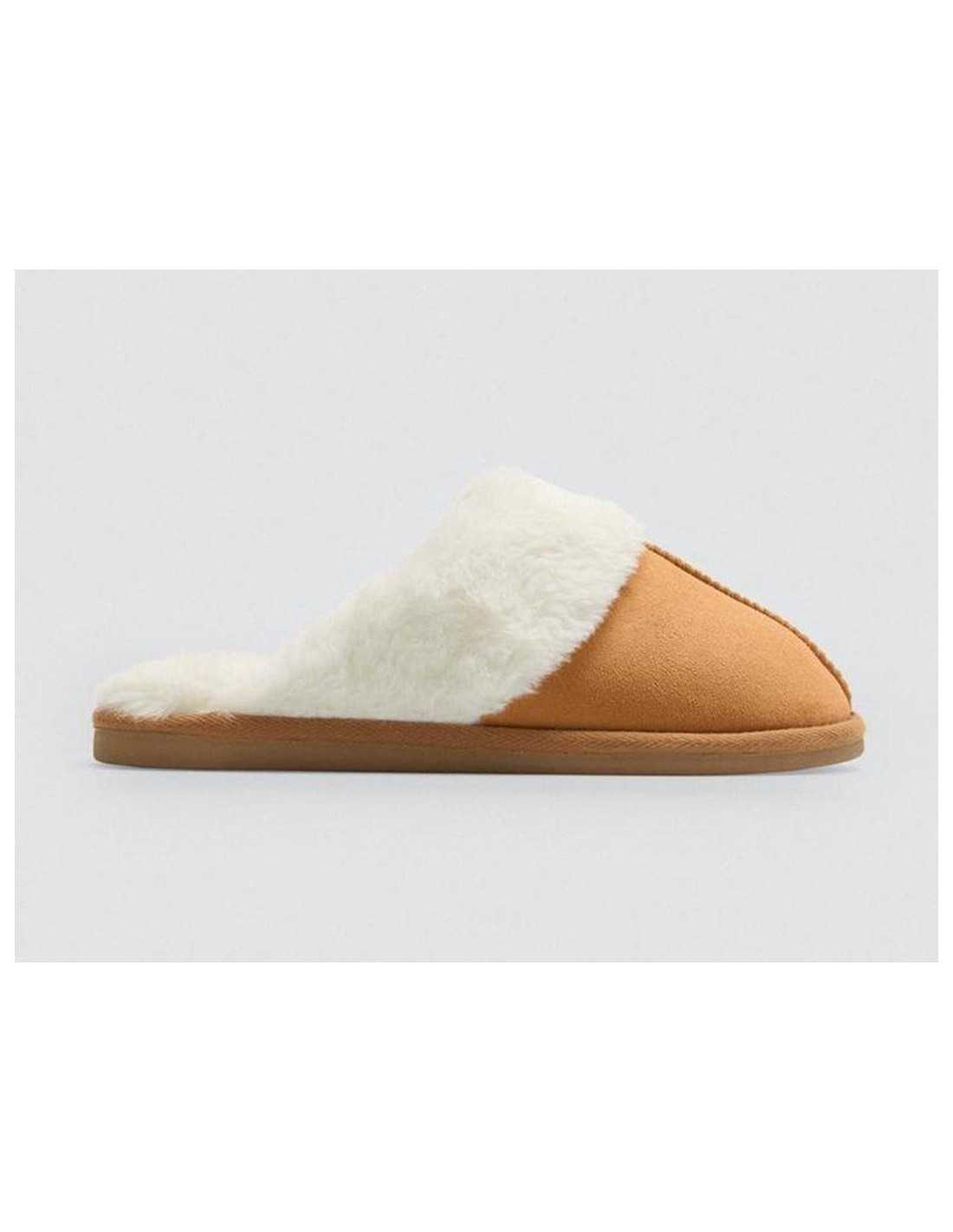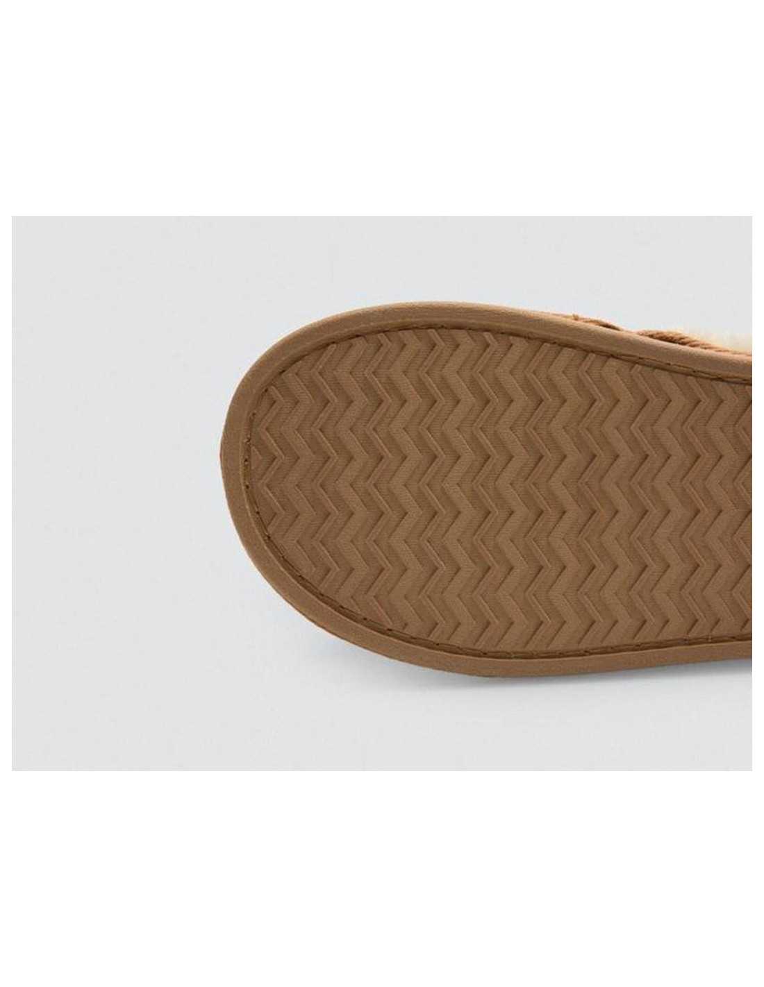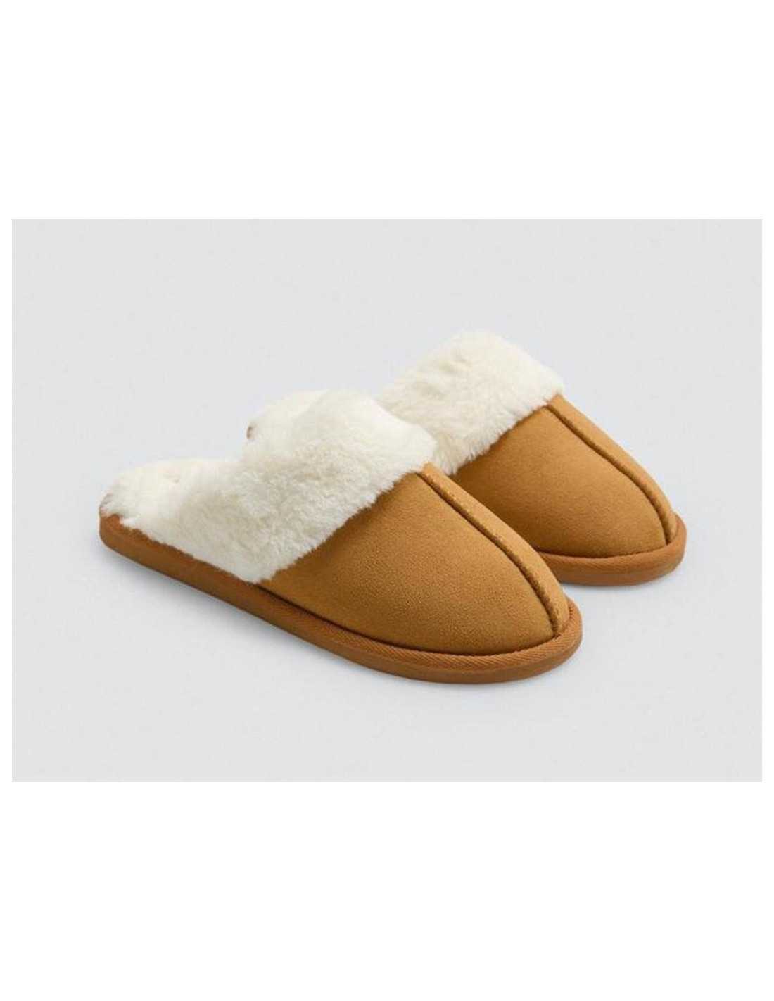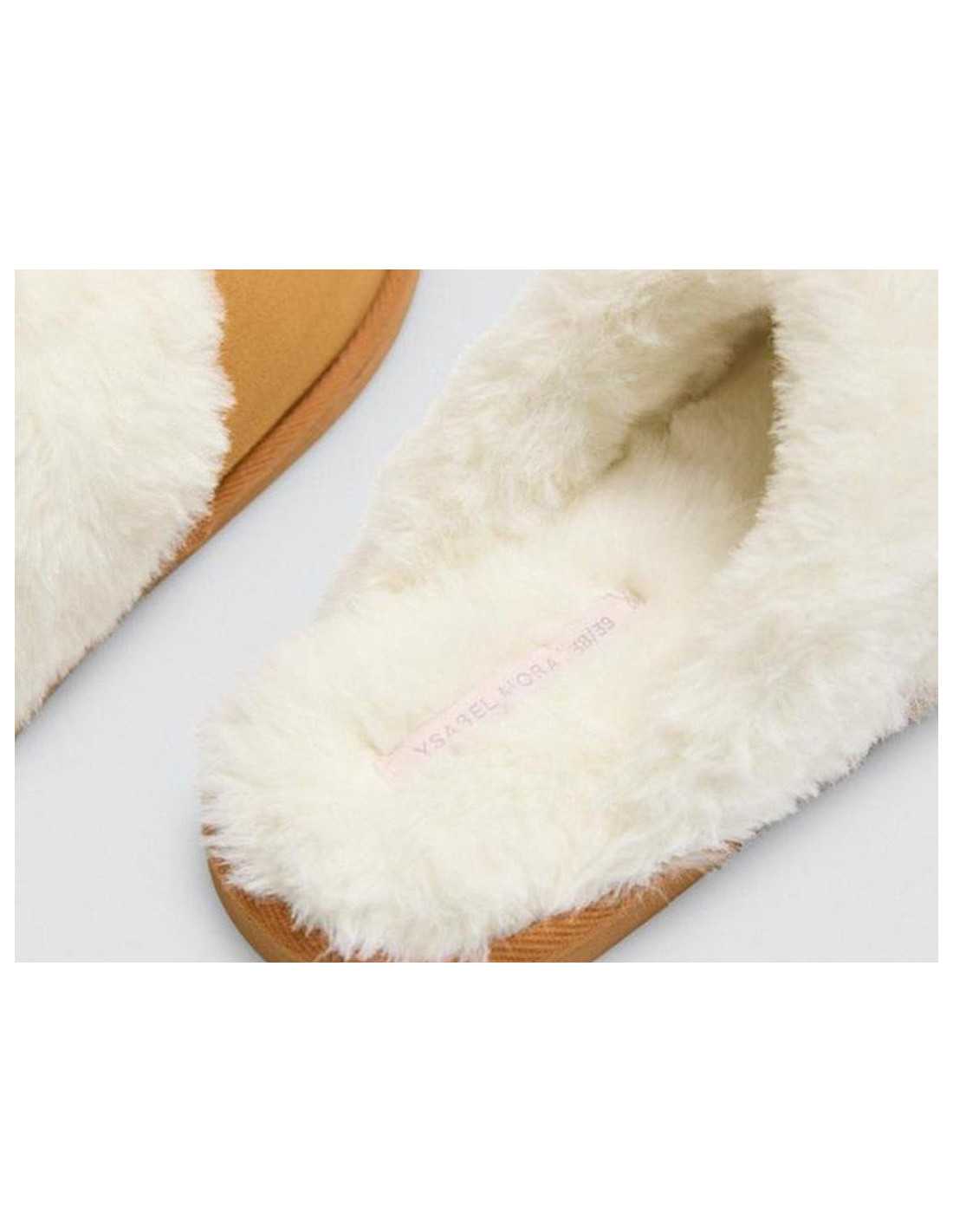 Zapatillas de casa Nuka para mujer. Disfruta del confort absoluto con estas zapatillas de casa en tono marrón claro, confeccionadas en un material tipo ante que aporta elegancia y suavidad al tacto. El interior está forrado con un tejido blanco esponjoso que sobresale por el borde superior, envolviendo el pie en una sensación cálida y mullida.