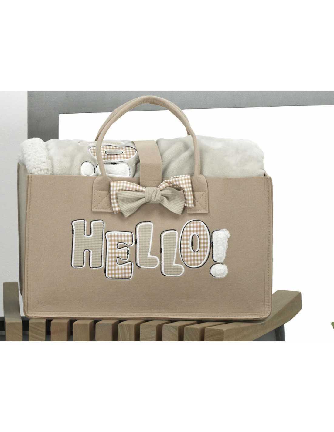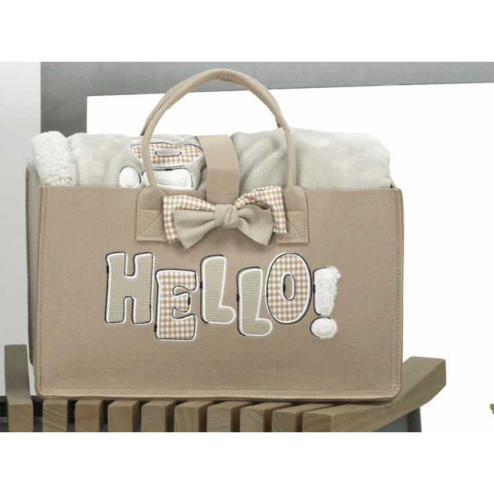 Plaid de sedalina y reverso de borreguito, con la palabra "HELLO" cosida y una cesta para guardarla cunado no la uses. Un regalo muy original perfecto para regalar. Gramaje 480 gramos.