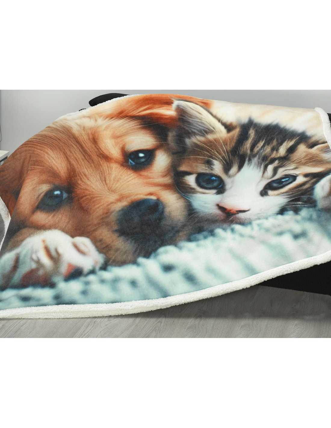 Plaid de sedalina y reverso de borreguito, con un encantador estampado de un perrito y un gatito muy simpáticos. Gramaje 480 gramos.