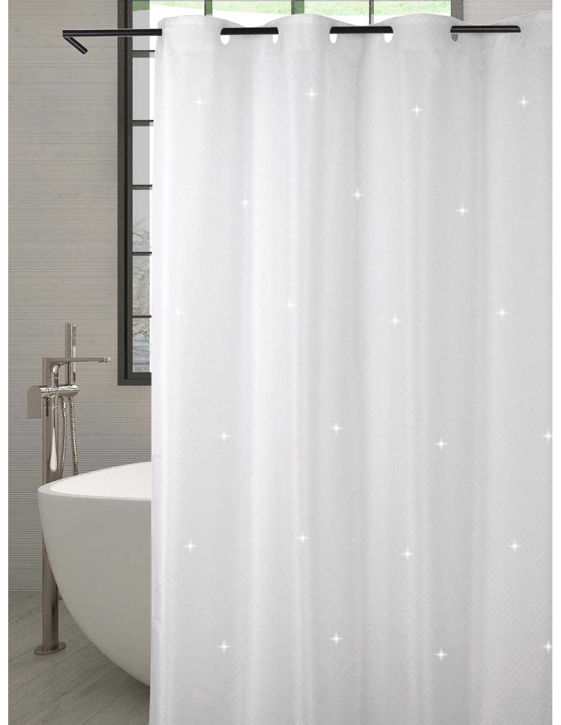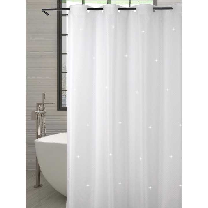 Cortina de banheiro de secagem rápida com estampa de pontos prateados brilhantes sobre fundo branco. Com sistema de posicionamento rápido "Click Clack"