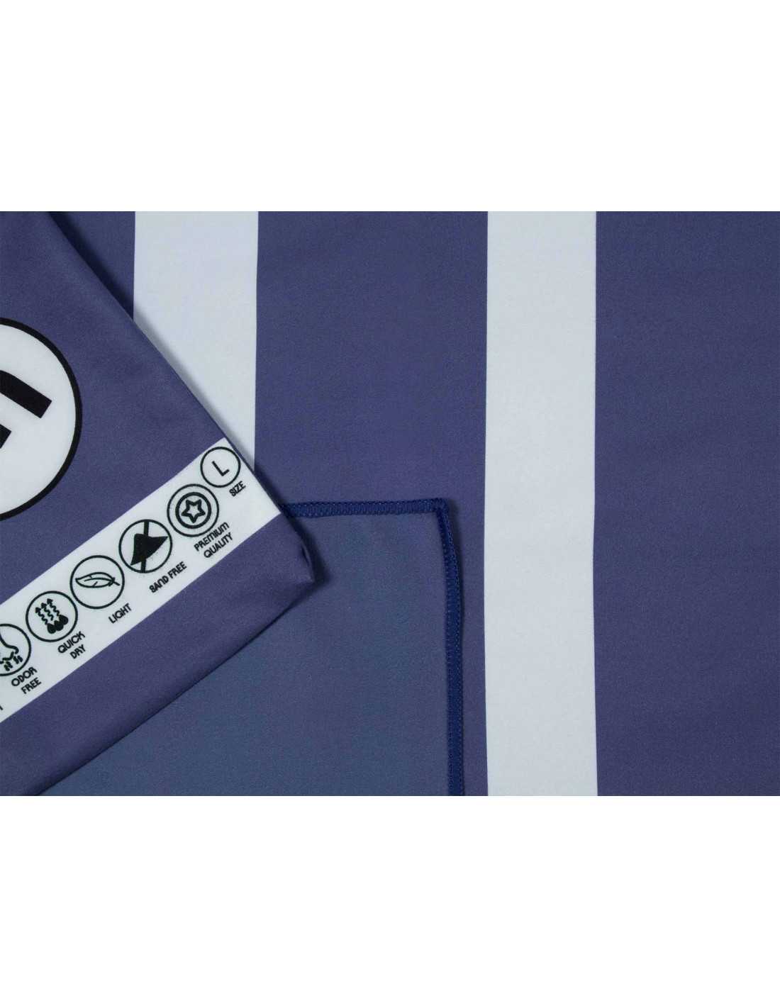 Linda toalha de microfibra em duas cores diferentes e com estampa listrada branca, tem um aro em um canto para pendurar e uma bolsa de 16x24 cm. Com cadarços para fechar, feito da mesma microfibra e estampa da toalha, o que a torna muito confortável de usar.