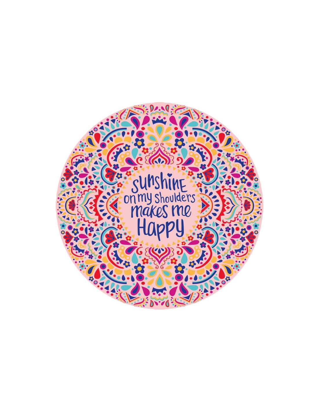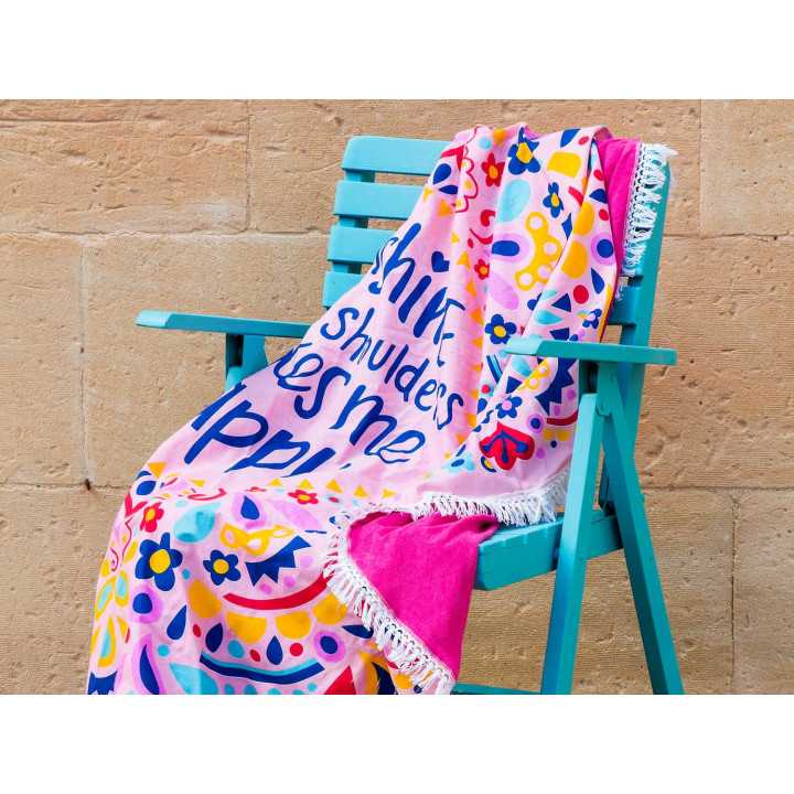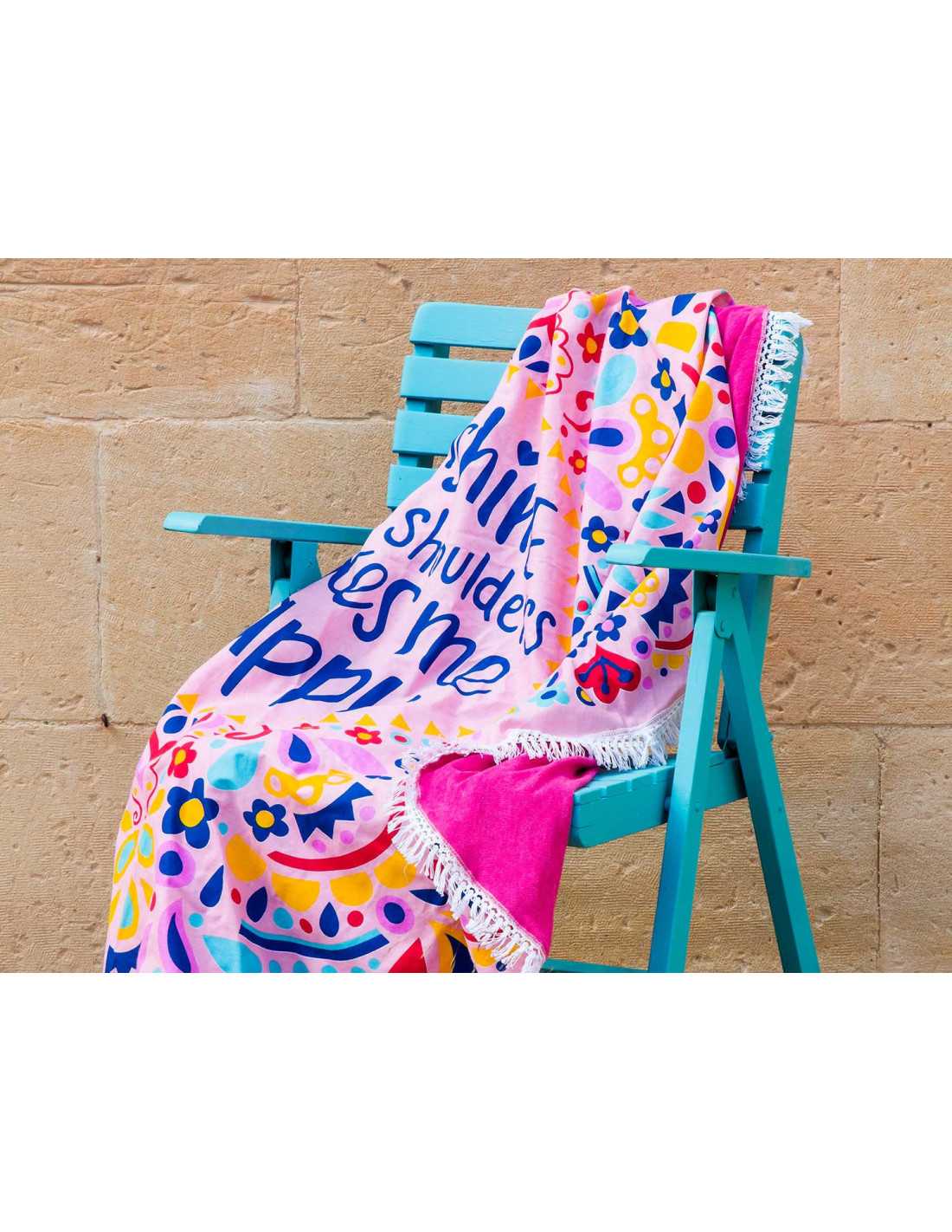 Simpática toalha de praia pareo redonda, muito leve e prática, tem um original estampado multicolorido com mensagem central e franjas brancas.