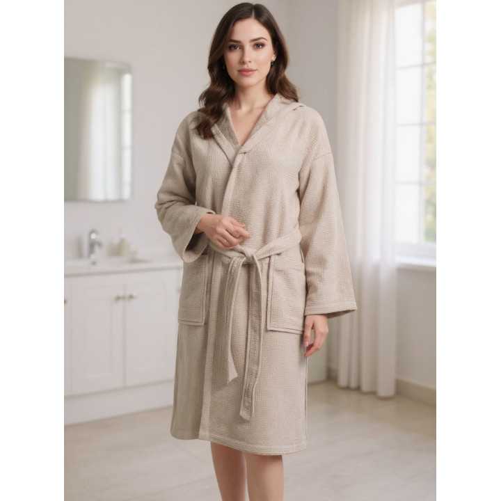 O robe de banho Maya na cor bege é um modelo de alta qualidade, com interior em turco 100% algodão e exterior em tecido favo de mel de grande suavidade.