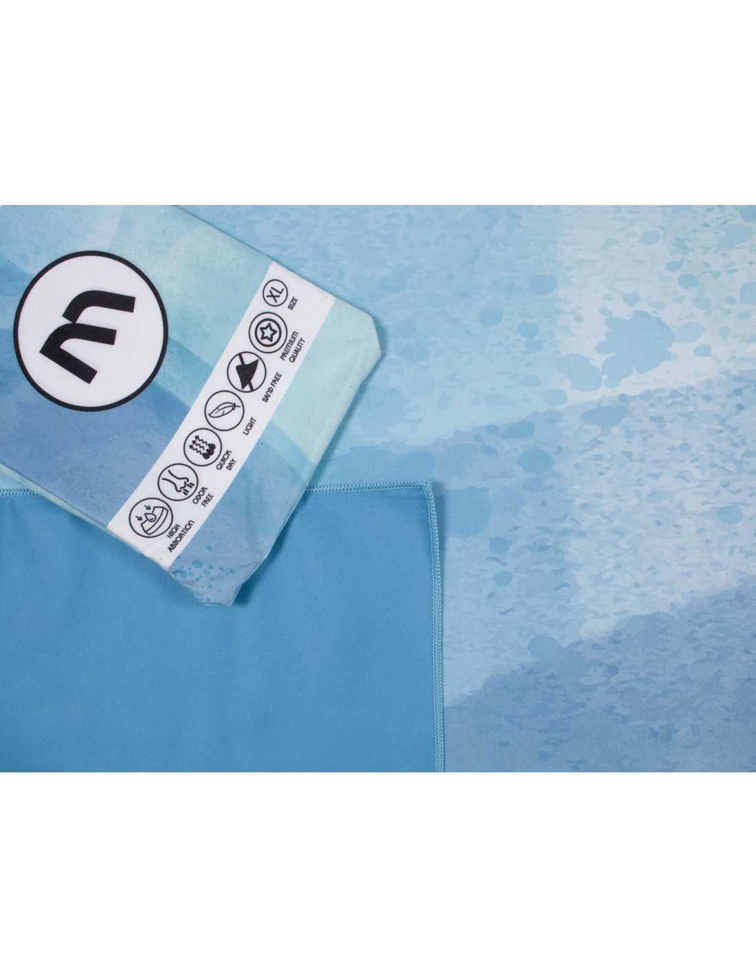 Linda toalha de microfibra de um lado tem um padrão original em tons de azul e no reverso é em azul liso, tem uma bolsa de 20x30 cm. Com cadarços para fechar, feito da mesma microfibra e estampa da toalha, o que a torna muito confortável de usar.