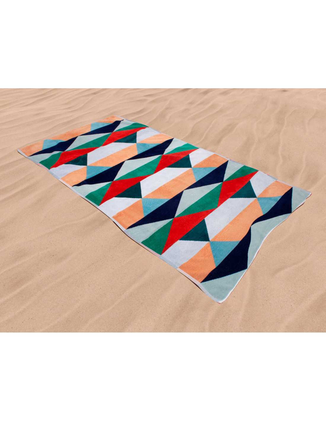 Esta toalha de praia tem um desenho geométrico original em cores vivas. Um design moderno para estar em dia quando for à praia ou piscina.