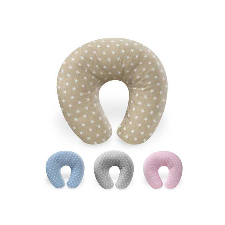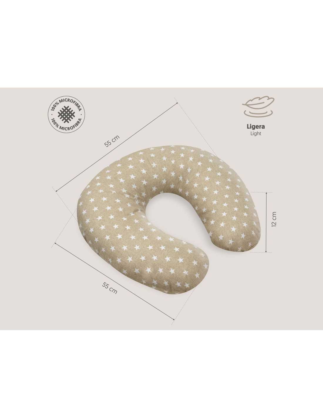Almofada de amamentação bege com estrelas, concebida para ajudar as mães a amamentar os seus bebés e também para os apoiar em diferentes posições.