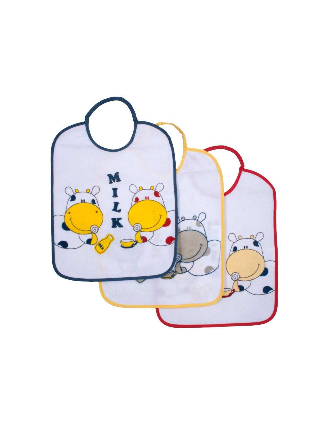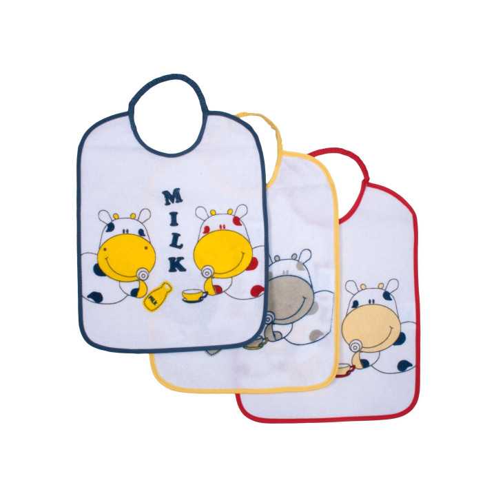 Babete de pano felpudo com um desenho engraçado de vaquinhas fofas.Apresentamos estes divertidos babetes de 28x30 cm. em um pacote de três. São constituídos por duas camadas: uma camada exterior de tecido felpudo 76% algodão e 24% poliéster e outra camada interior de 100% PEVA com duas panturrilhas sobre fundo branco e rebordo em três cores diferentes e com fecho de borracha.