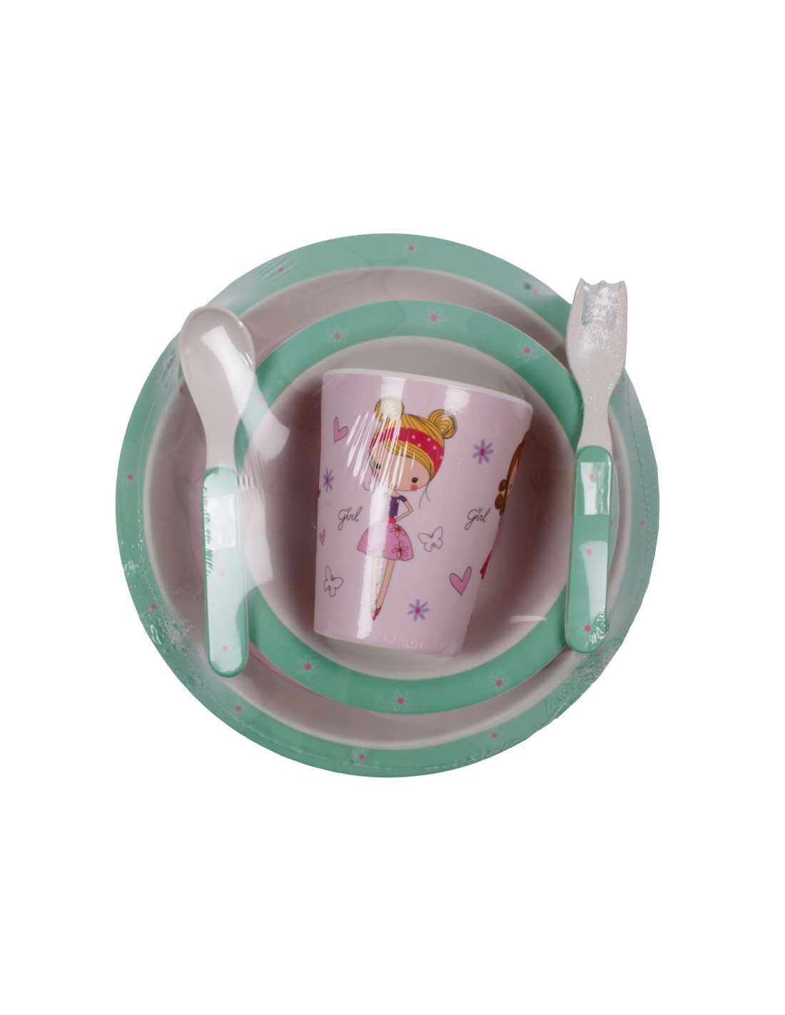 Conjunto divertido composto por 5 peças de loiça infantil da marca Gamberritos, composto por 1 prato raso, 1 tigela de pequeno-almoço, um copo, 1 garfo e uma colher.