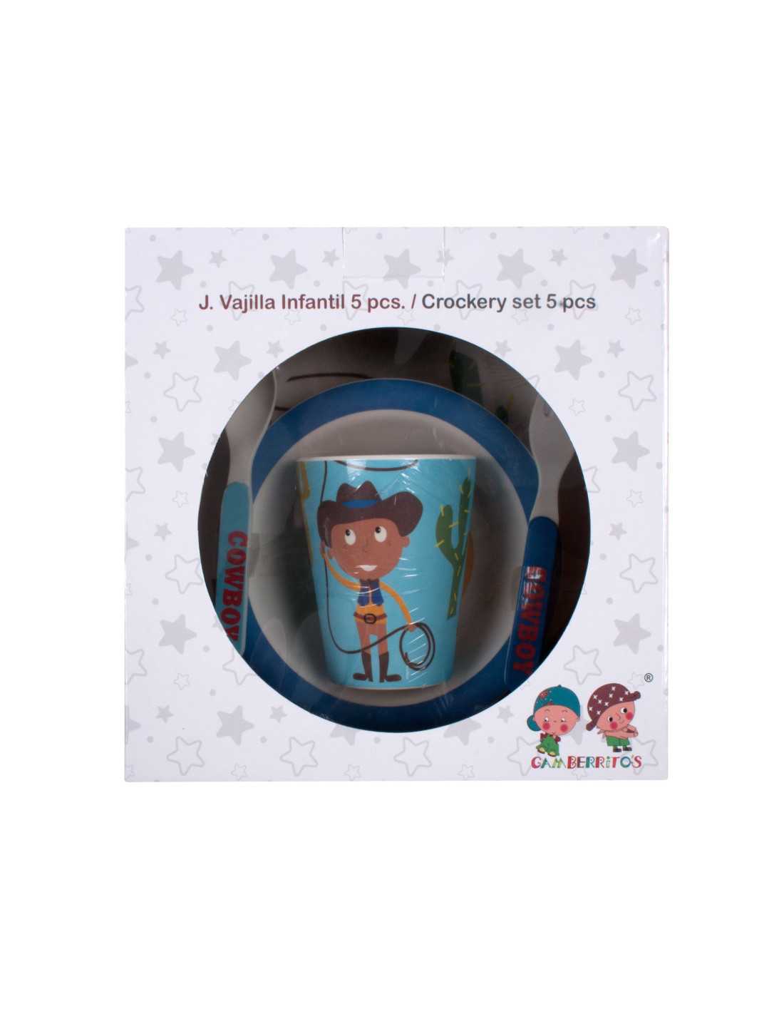 Conjunto divertido composto por 5 peças de loiça infantil da marca Gamberritos, composto por 1 prato raso, 1 tigela de pequeno-almoço, um copo, 1 garfo e uma colher.