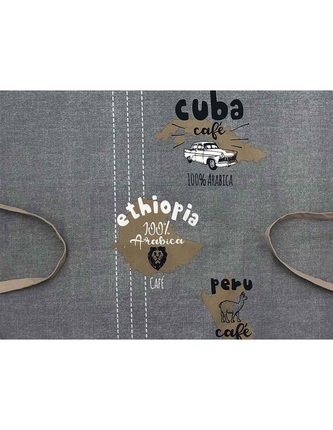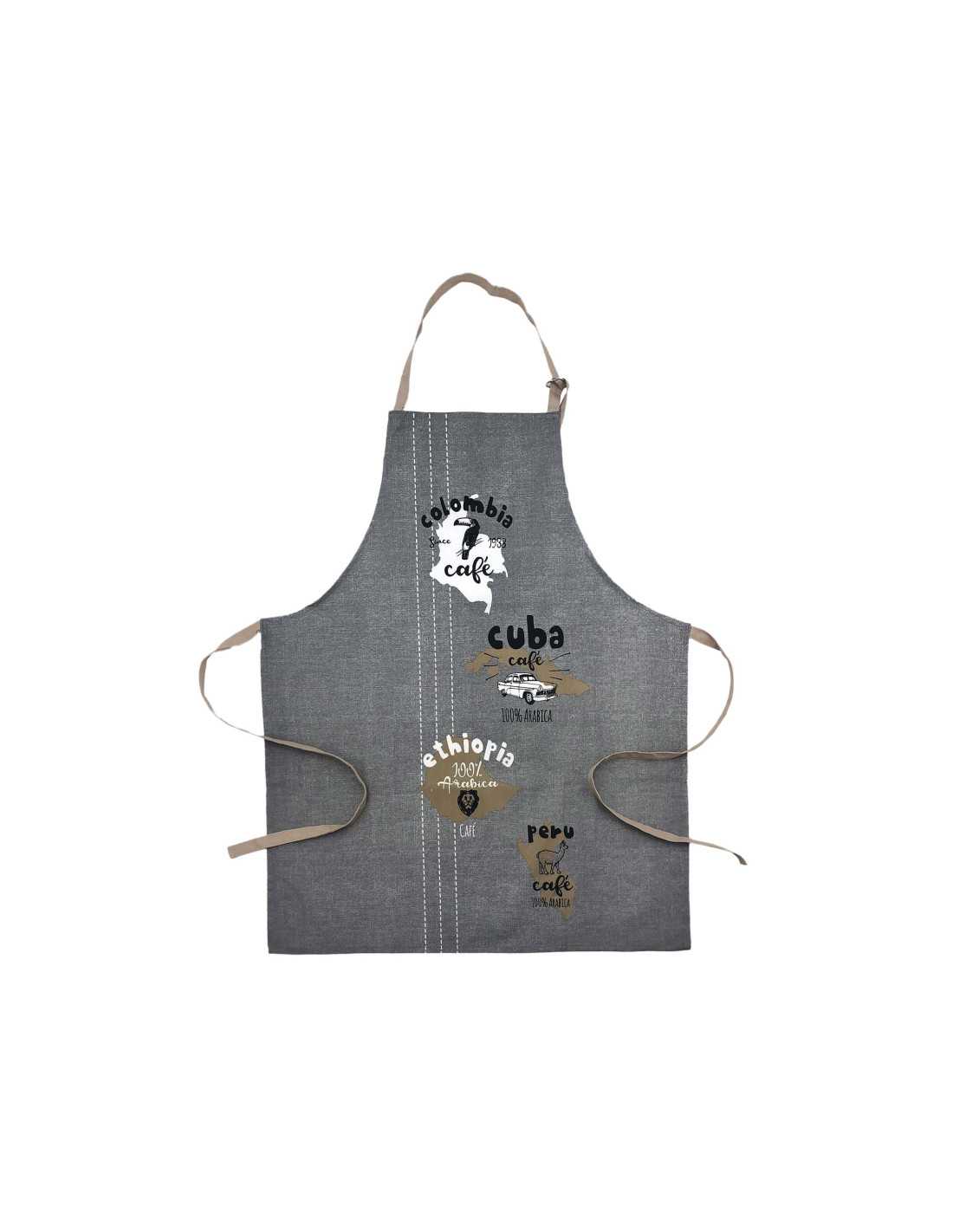 Um bonito avental cinzento com um estampado original e divertido, com ilustrações e os nomes dos principais produtores de café do mundo.