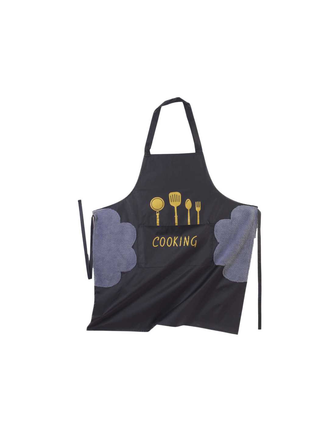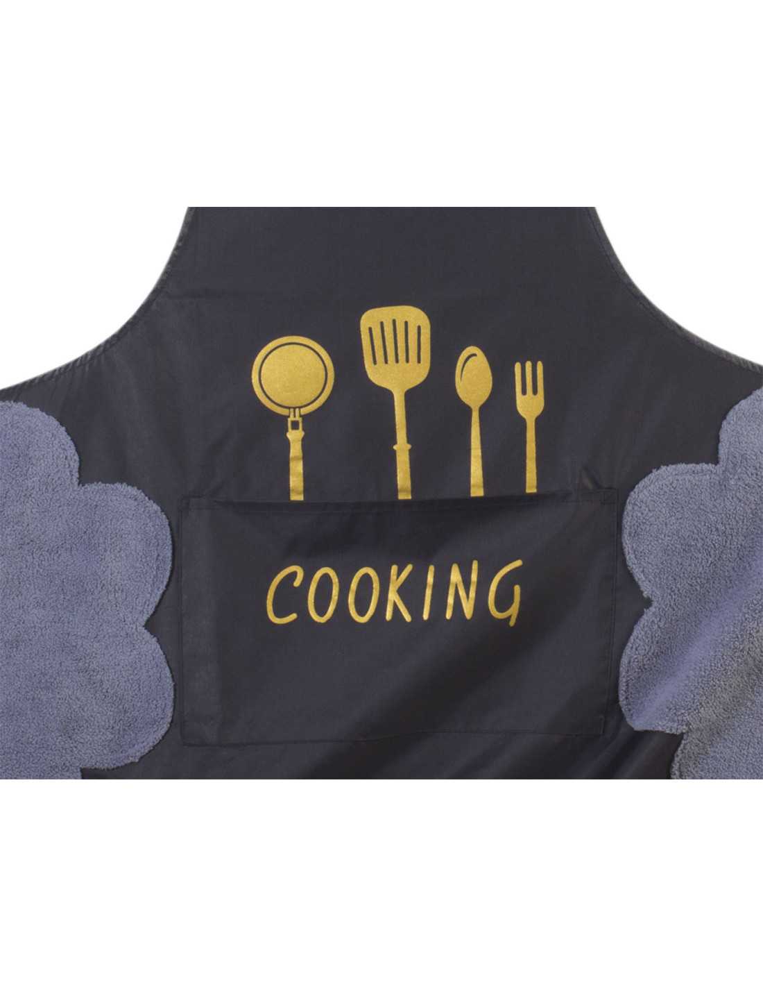 Avental de cozinha cinzento escuro com utensílios de cozinha e simpáticas nuvens em felpo absorvente. Com bolso central.